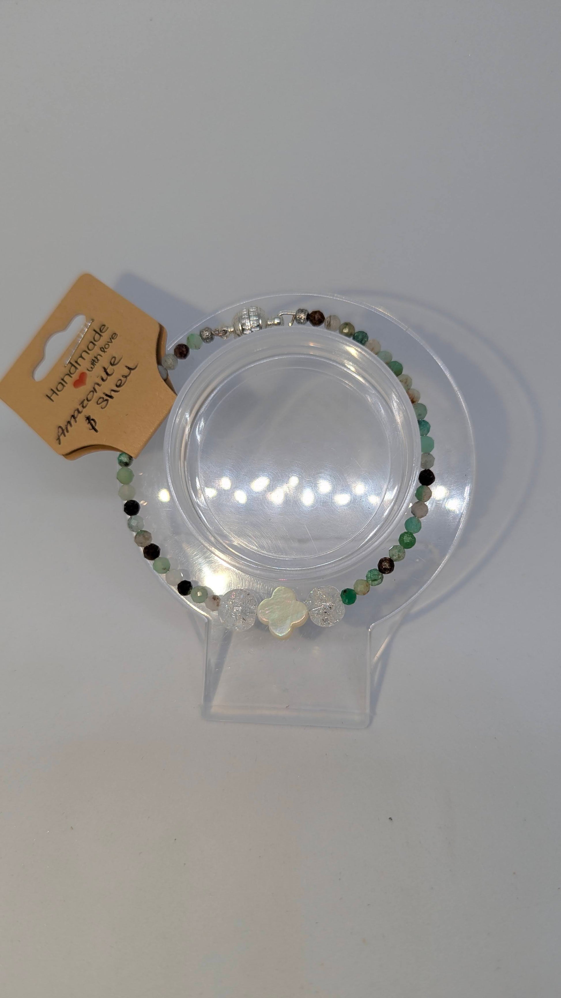 Experience the calming and healing properties of Amazonite with our unique bracelet. Each tiny amazonite stone is accentuated by cracked clear spacers, finished with a silver magnetic clasp. Adorned with a shell clover charm, this bracelet brings a touch of nature and serenity to your everyday style.