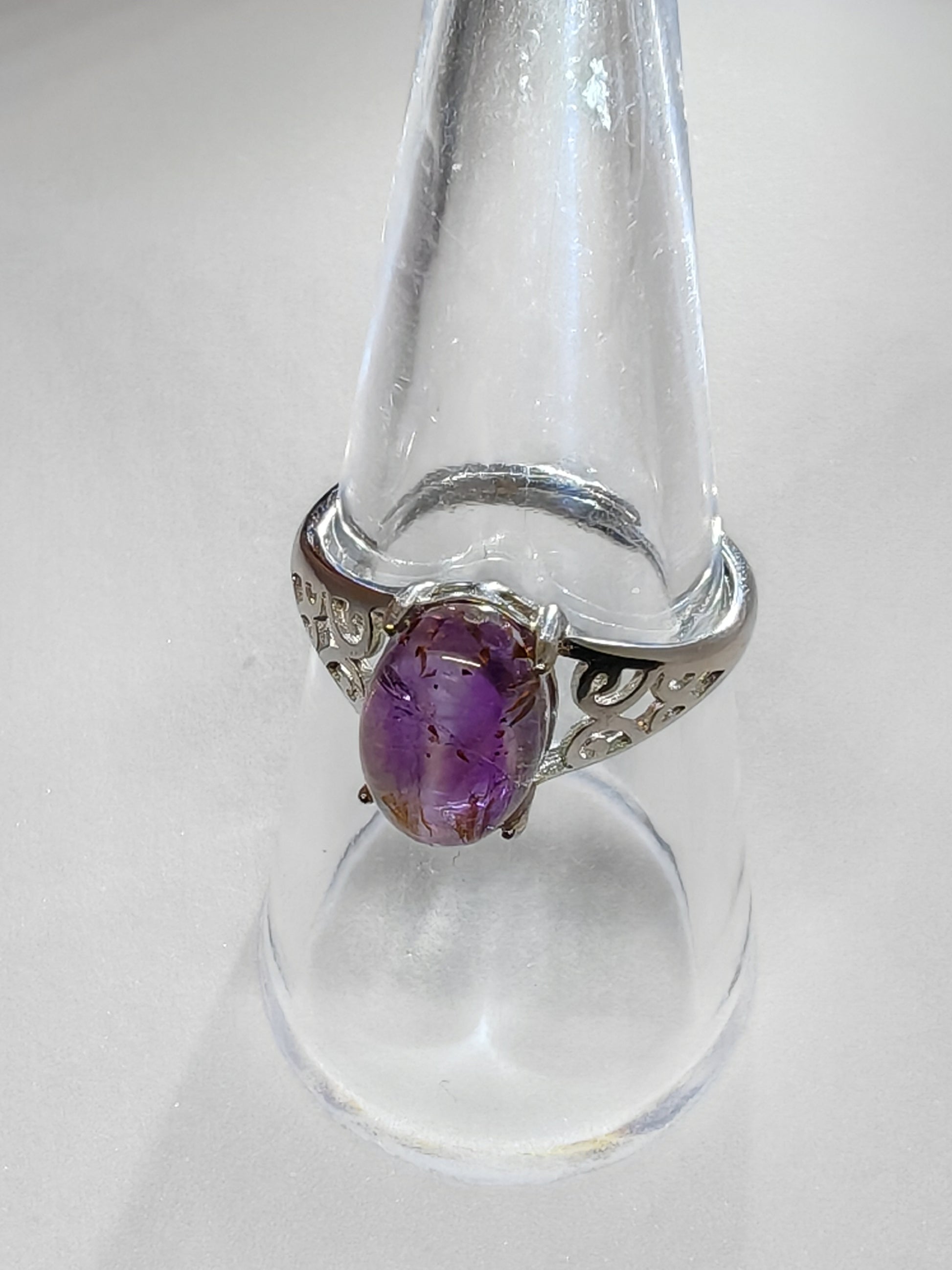 A large oval auralite stone set in an adjustable sterling silver band. This stone really lets in the light and has a beautiful purple colour with small flecks of orange shining through.
