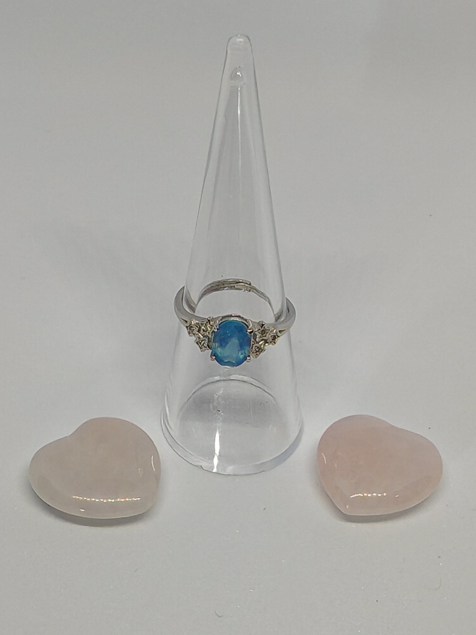 Wish upon a star and wish for this ring with a stunning vibrant blue aqua stone. Surrounded by 6 stars of cz. This ring really does catch the light well and is set in a sterling silver band adjustable up to a Q.