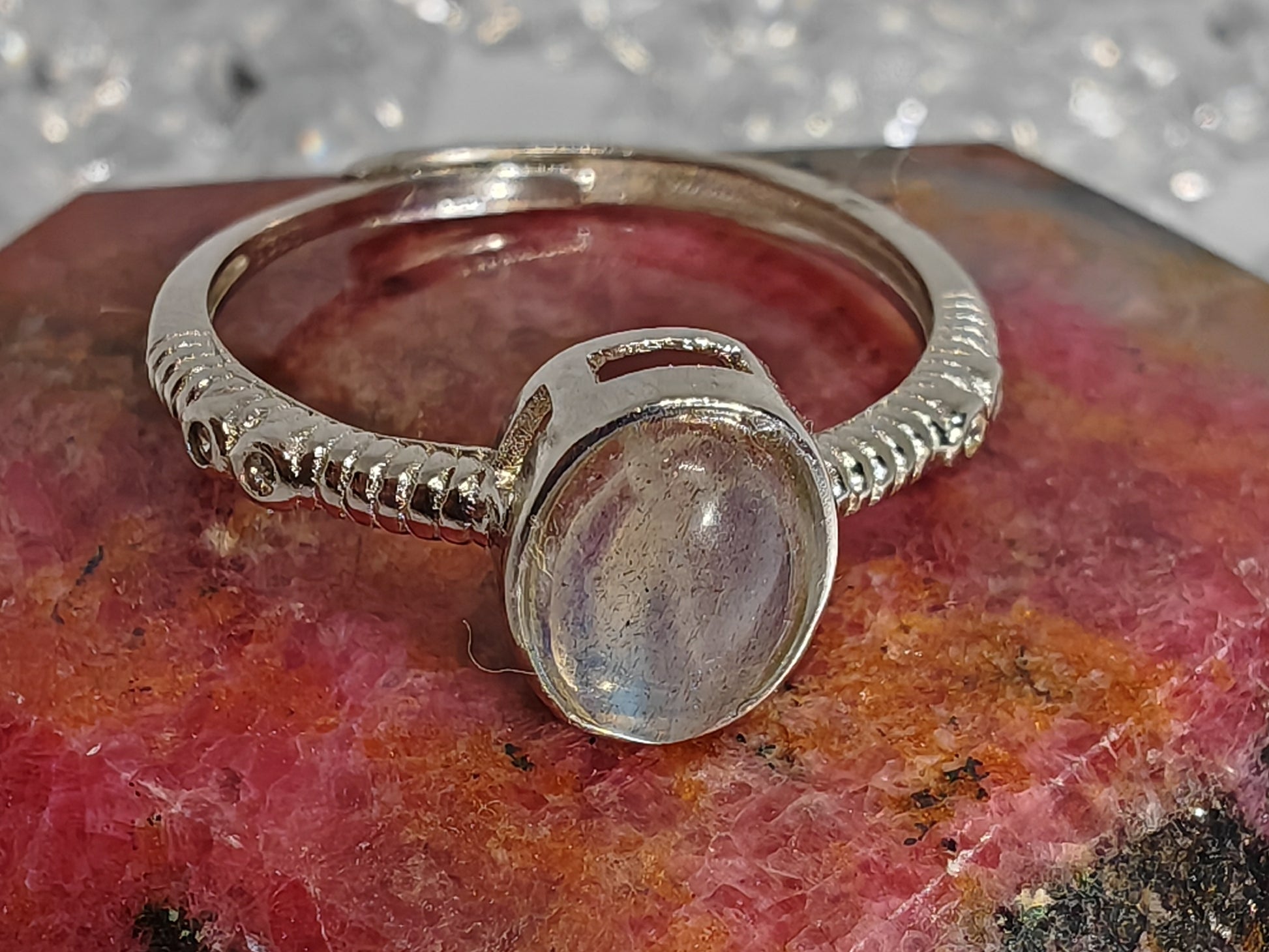 This adjustable ring features a beautiful labradorite stone and sterling silver band with cubic zirconia accents. With the ability to fit up to size R, it is both dainty and elegant, making it the perfect accessory for any occasion. Add a touch of sophistication to your jewelry collection with the Elegant Lab ring.