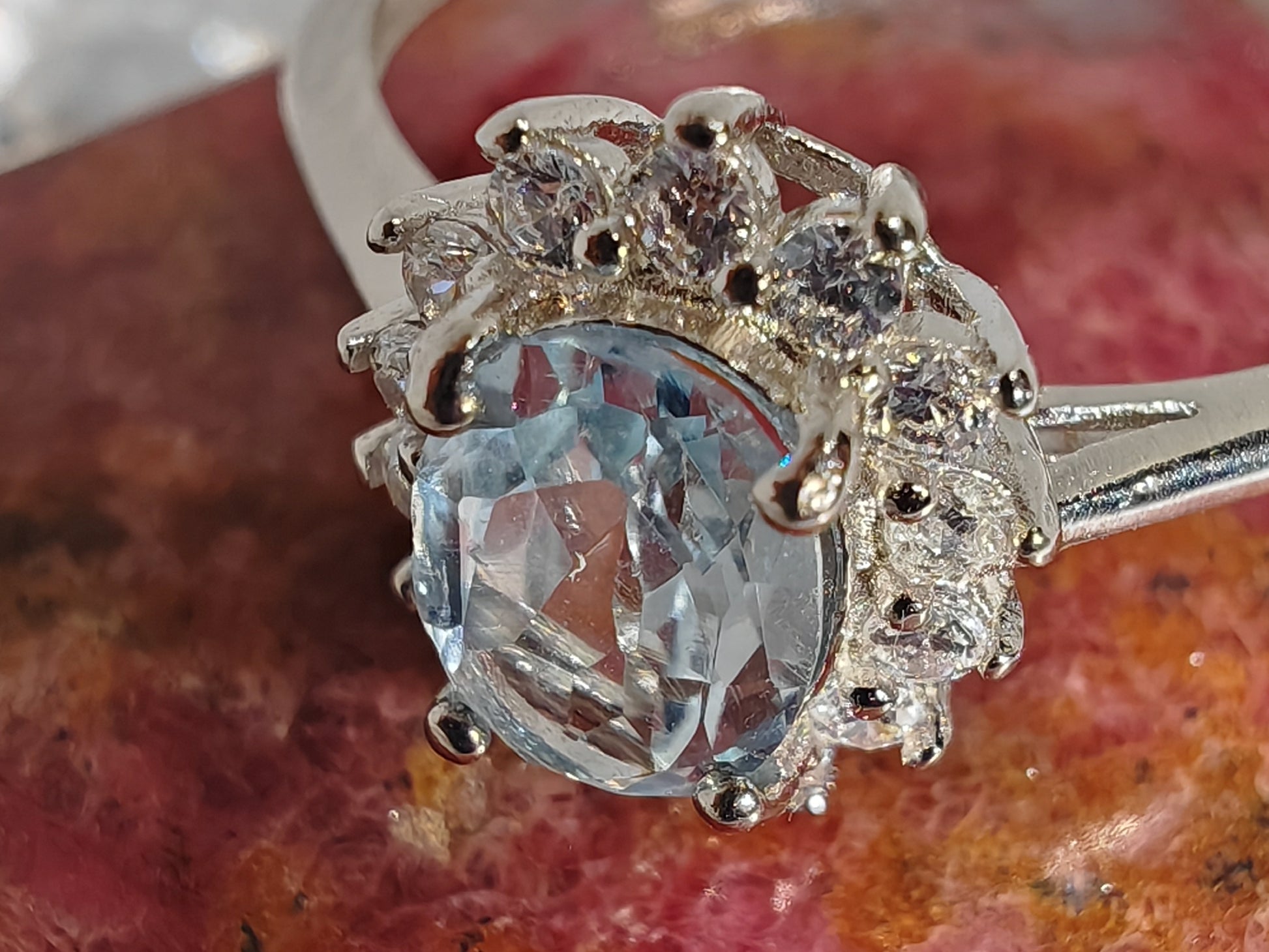 Add a touch of "Frozen" magic to your style with our Frosty Topaz ring. The light blue topaz center stone is surrounded by sparkling cubic zirconia, set on a sterling silver band that is adjustable up to a size T. Stay cool and chic with this 7mm gem. Let it snow!