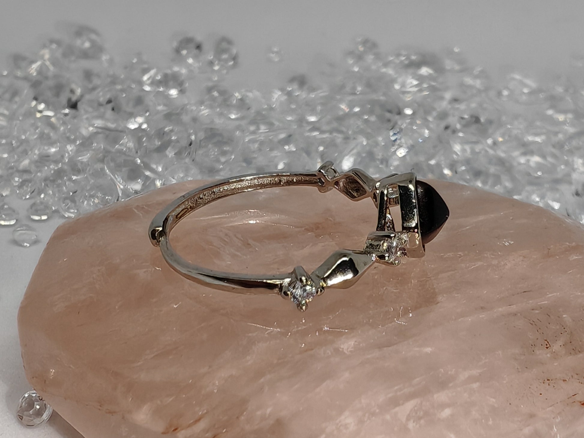 Add a pop of color to your outfit with our Garnet Pyramid Sterling Silver Ring. The pyramid-shaped garnet stone in red and pink hues will stand out and catch everyone's eye. With 4 cubic zirconias surrounding the 6mm stone, this adjustable ring up to size R is a must-have accessory. Made with high-quality sterling silver, it's a perfect combination of elegance and style.