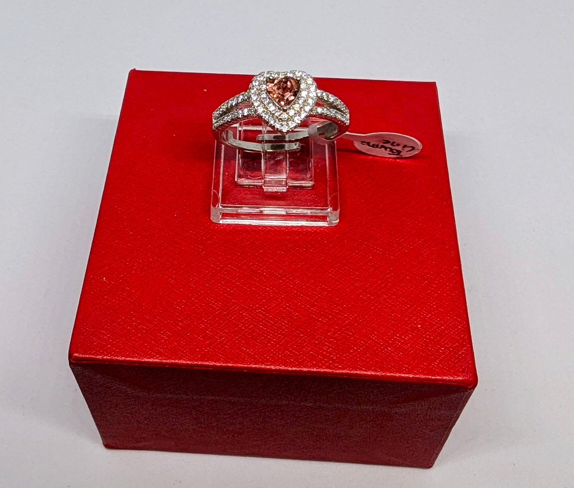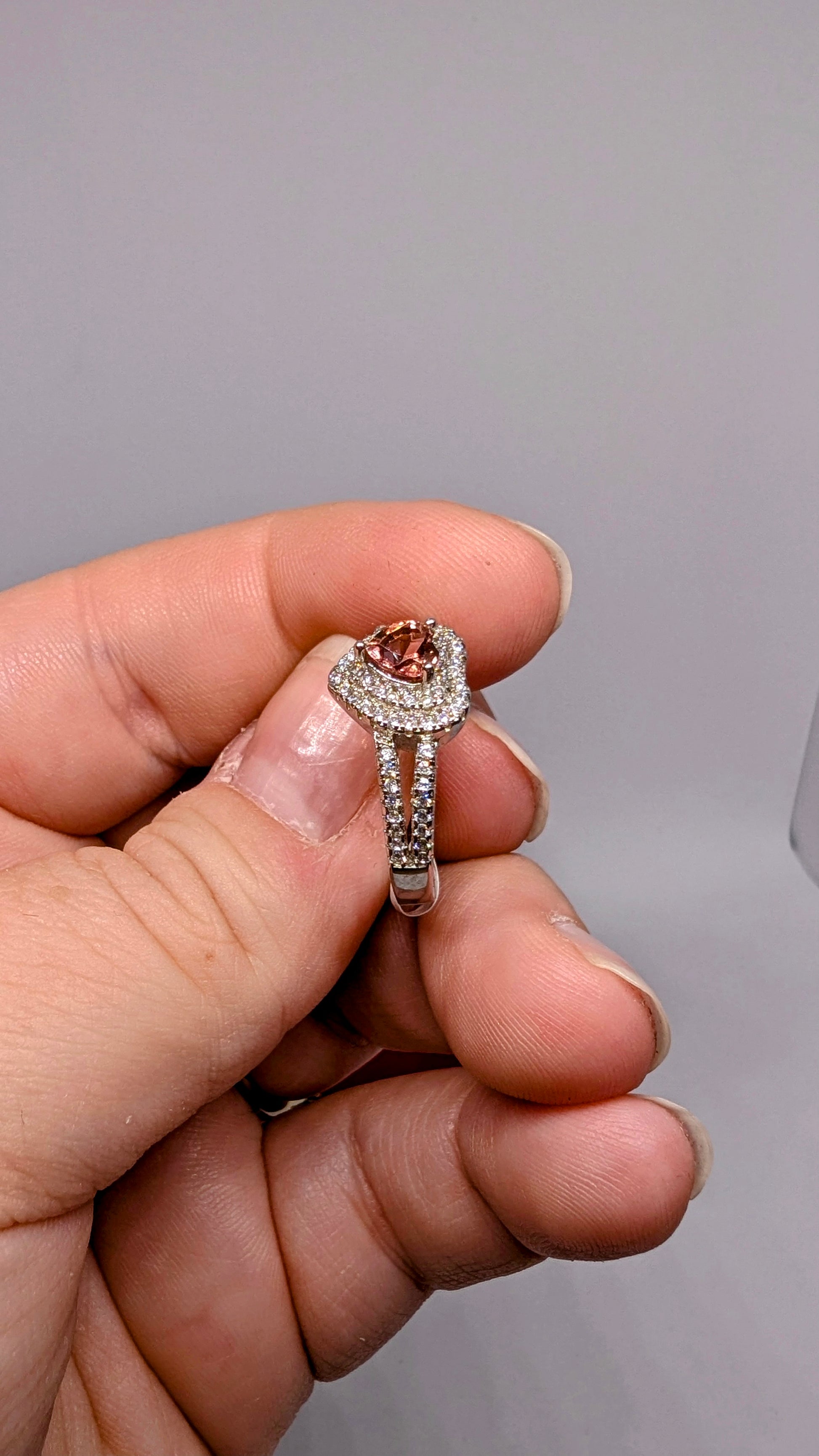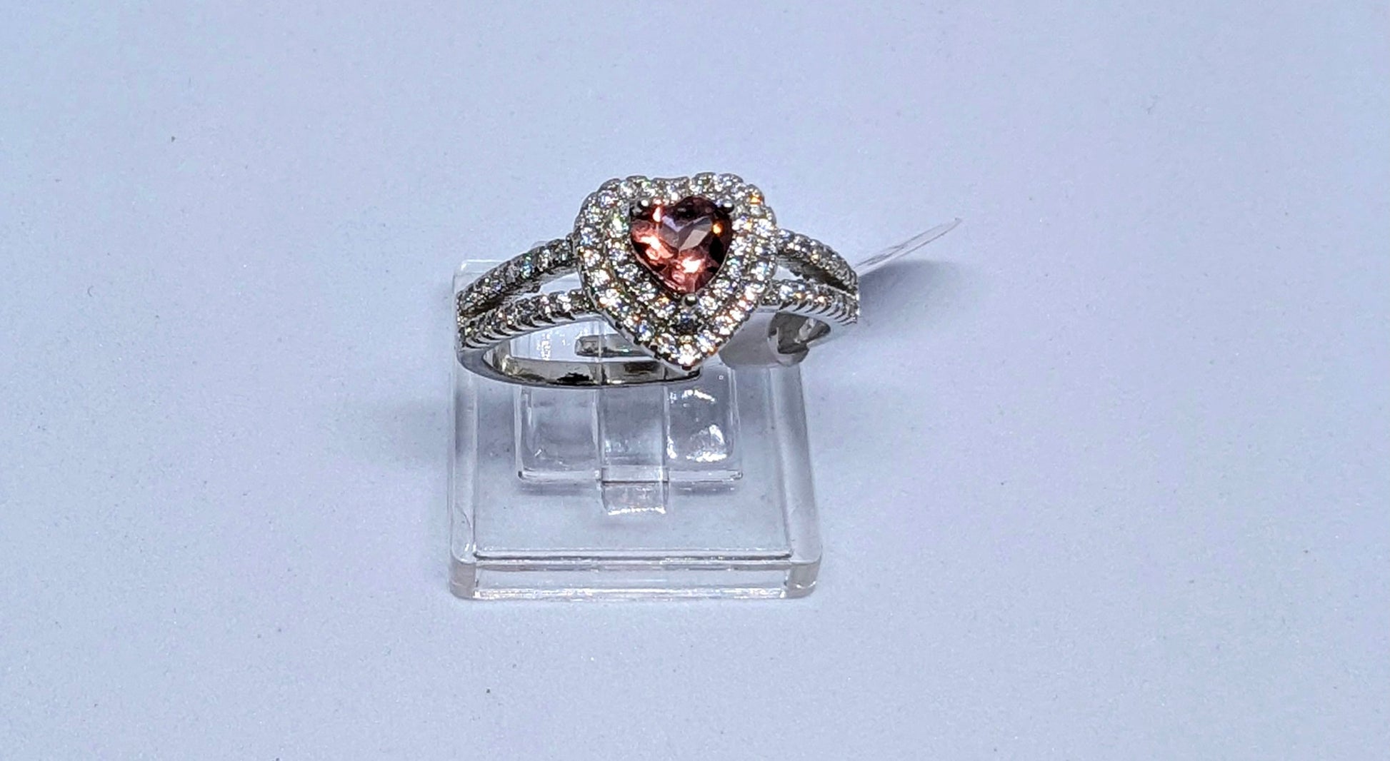 Experience the beauty and sparkle of the Heart of Diamonds ring. Featuring a stunning tourmaline heart surrounded by cubic zirconias, this ring is perfect for adding a touch of elegance to any outfit. The sterling silver band and adjustable size up to S make it both pretty and practical.