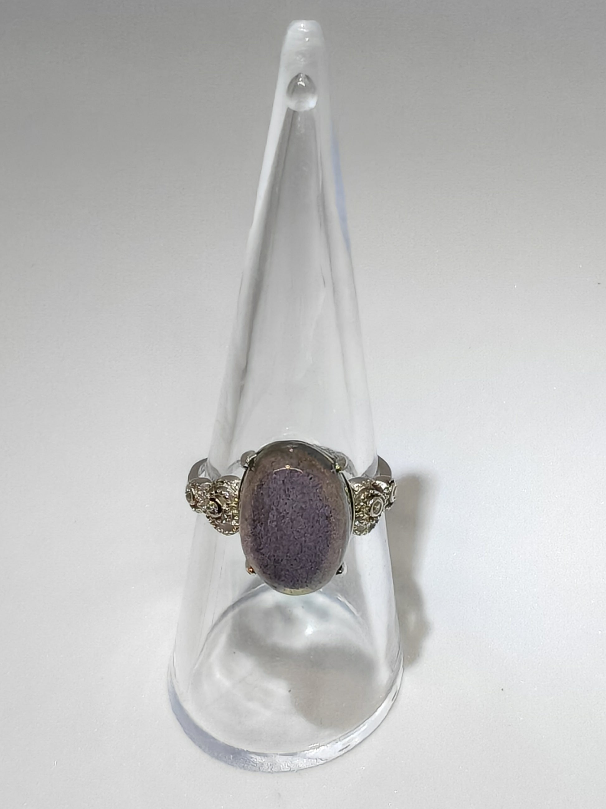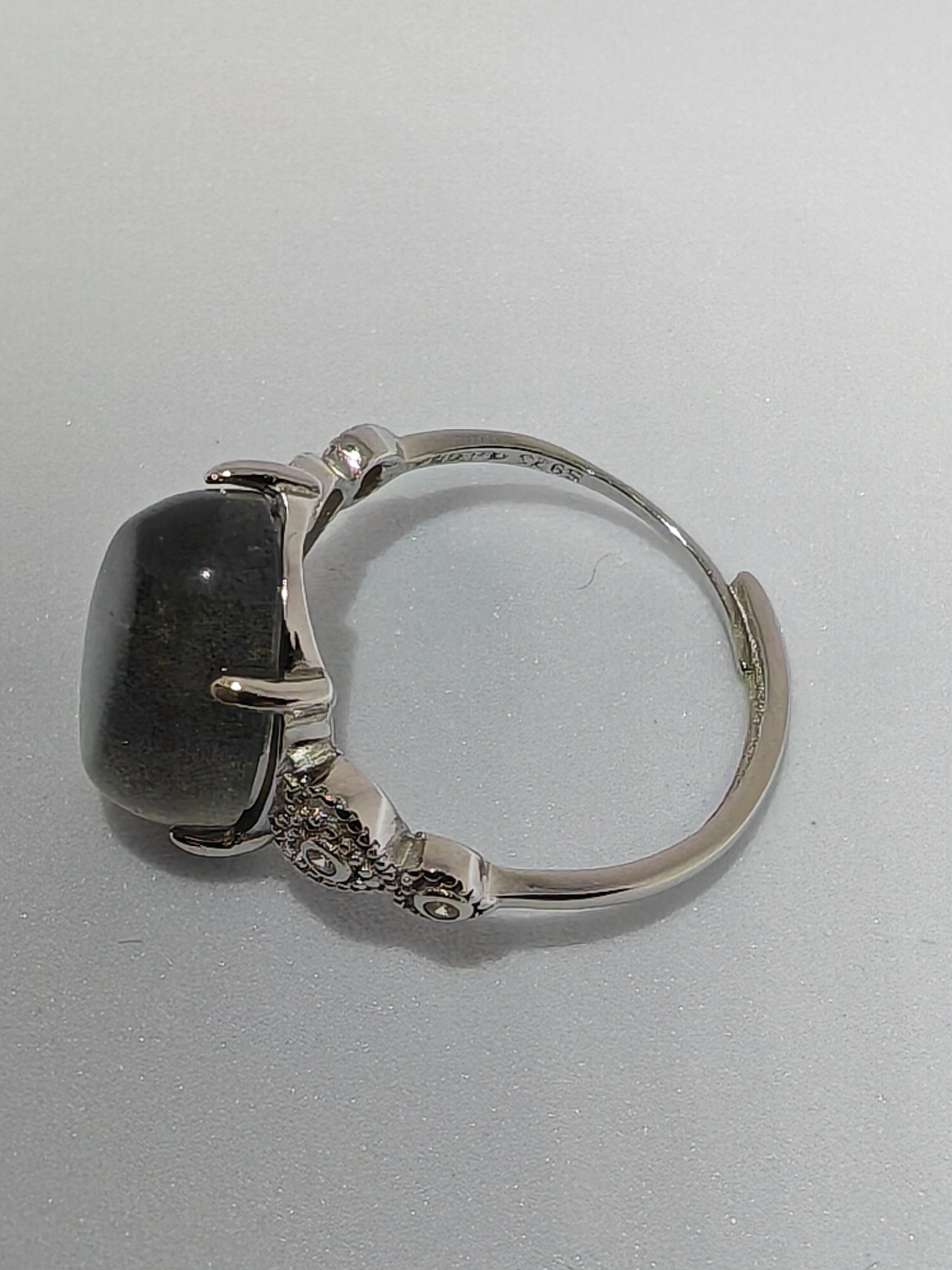 A large natural lab stone set in an adjustable sterling silver band seizing up to a Size R