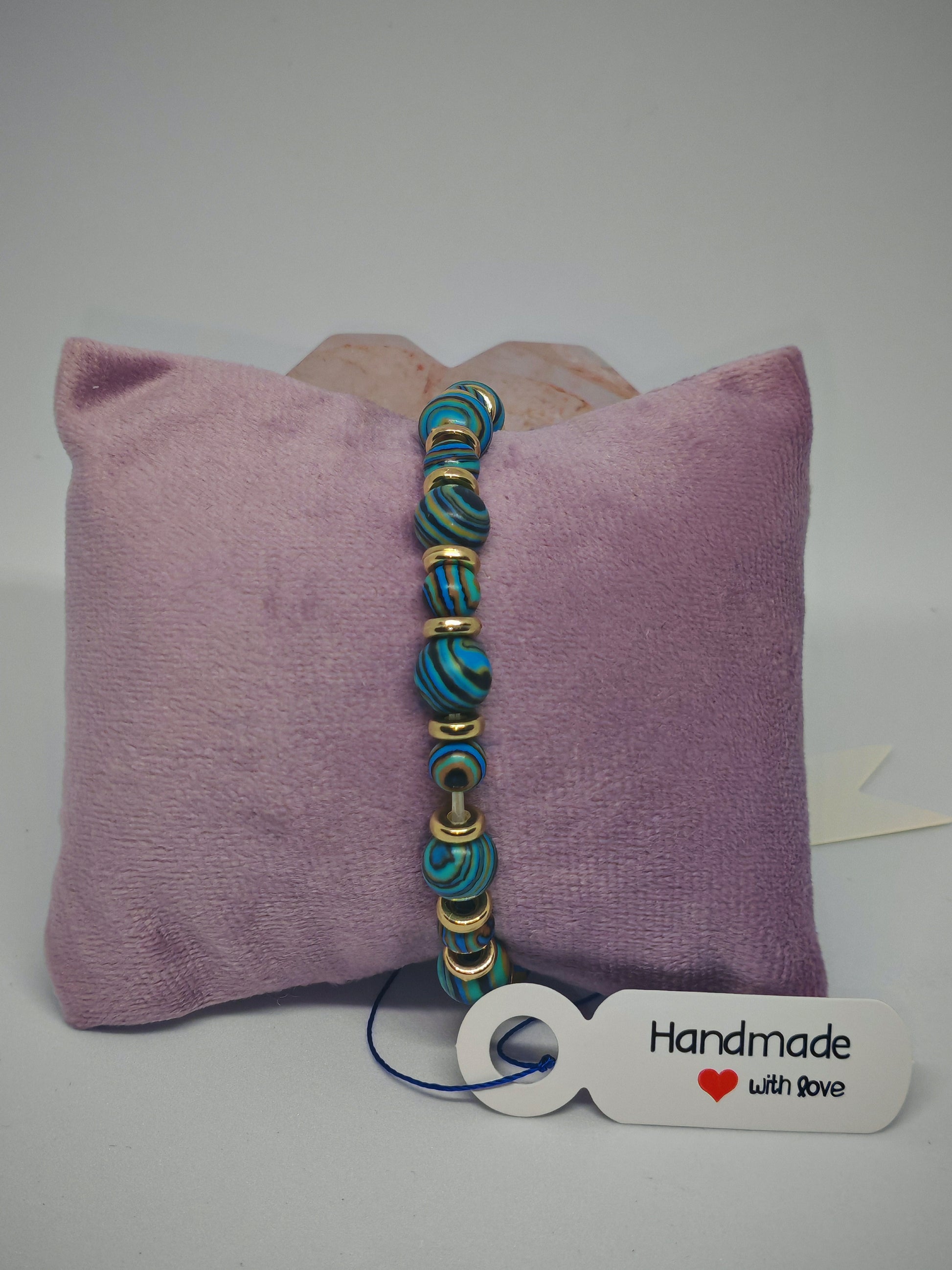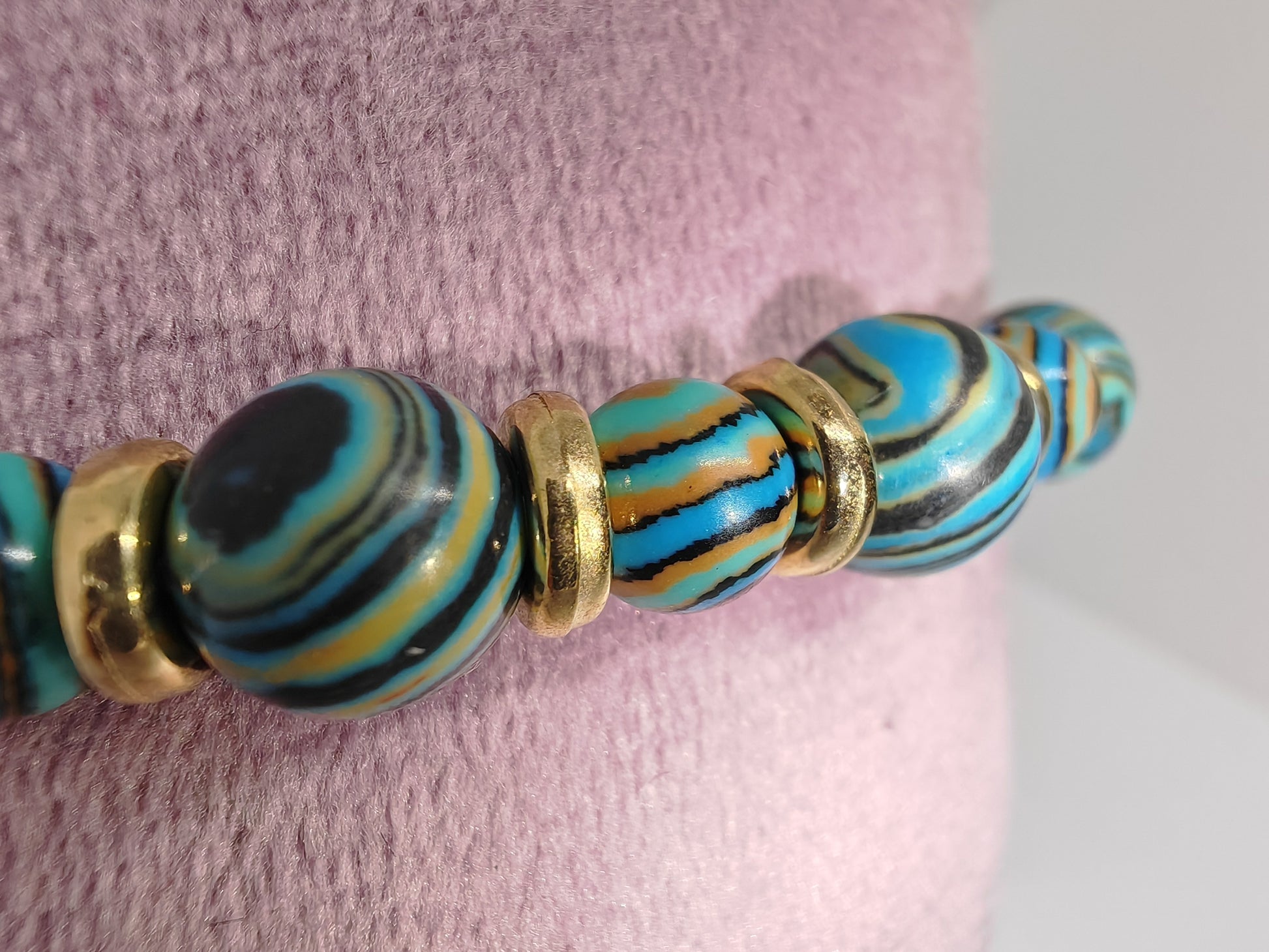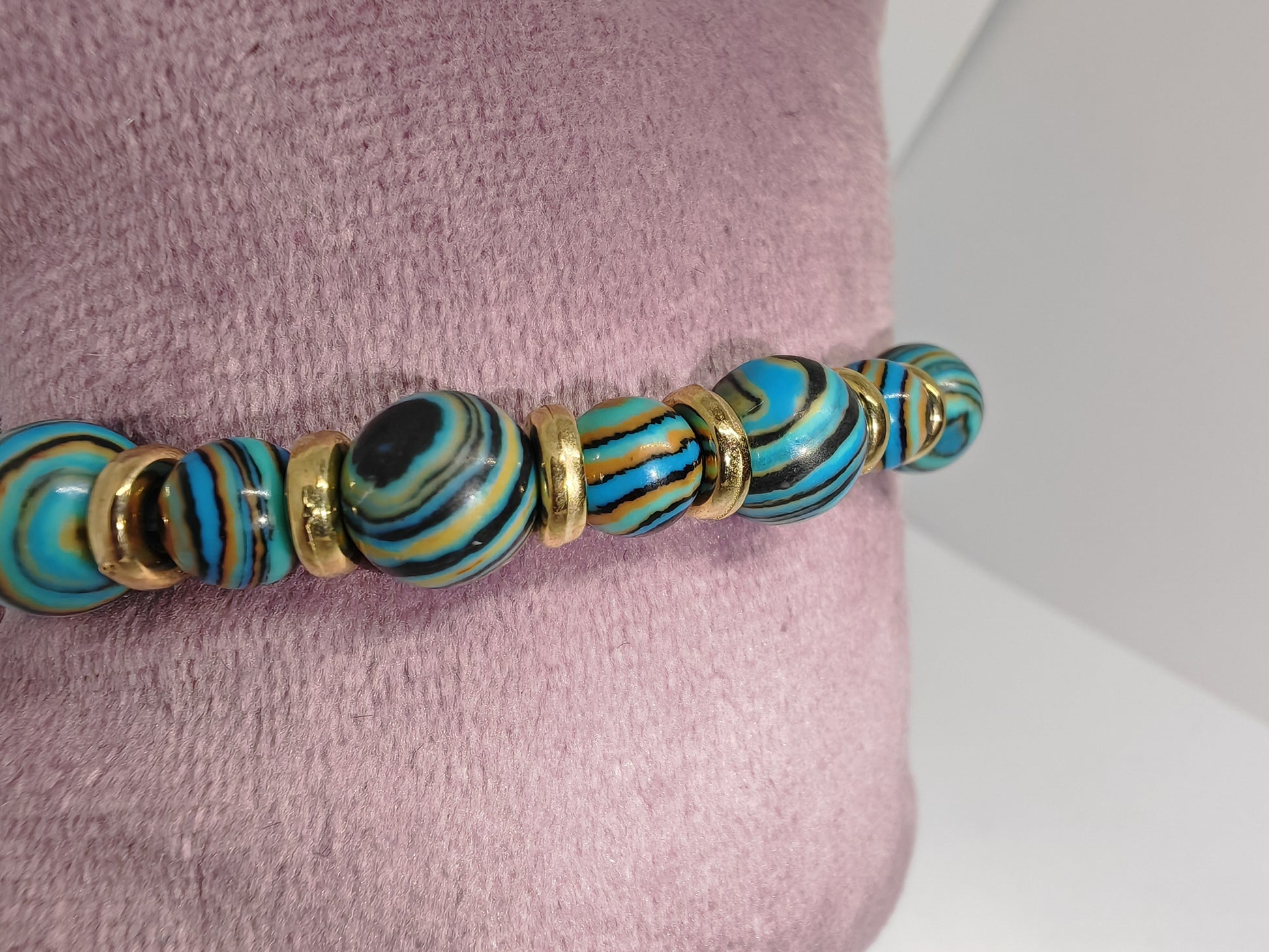 Striped Malachite with gold spacers.Add a touch of elegance to any outfit with our Malachite and gold stretch bracelet. The striped Malachite beads are accented by gold spacers, creating a stunning and unique design. This bracelet is not only stylish, but also convenient and comfortable with its stretch feature. Elevate your style with this beautiful accessory.