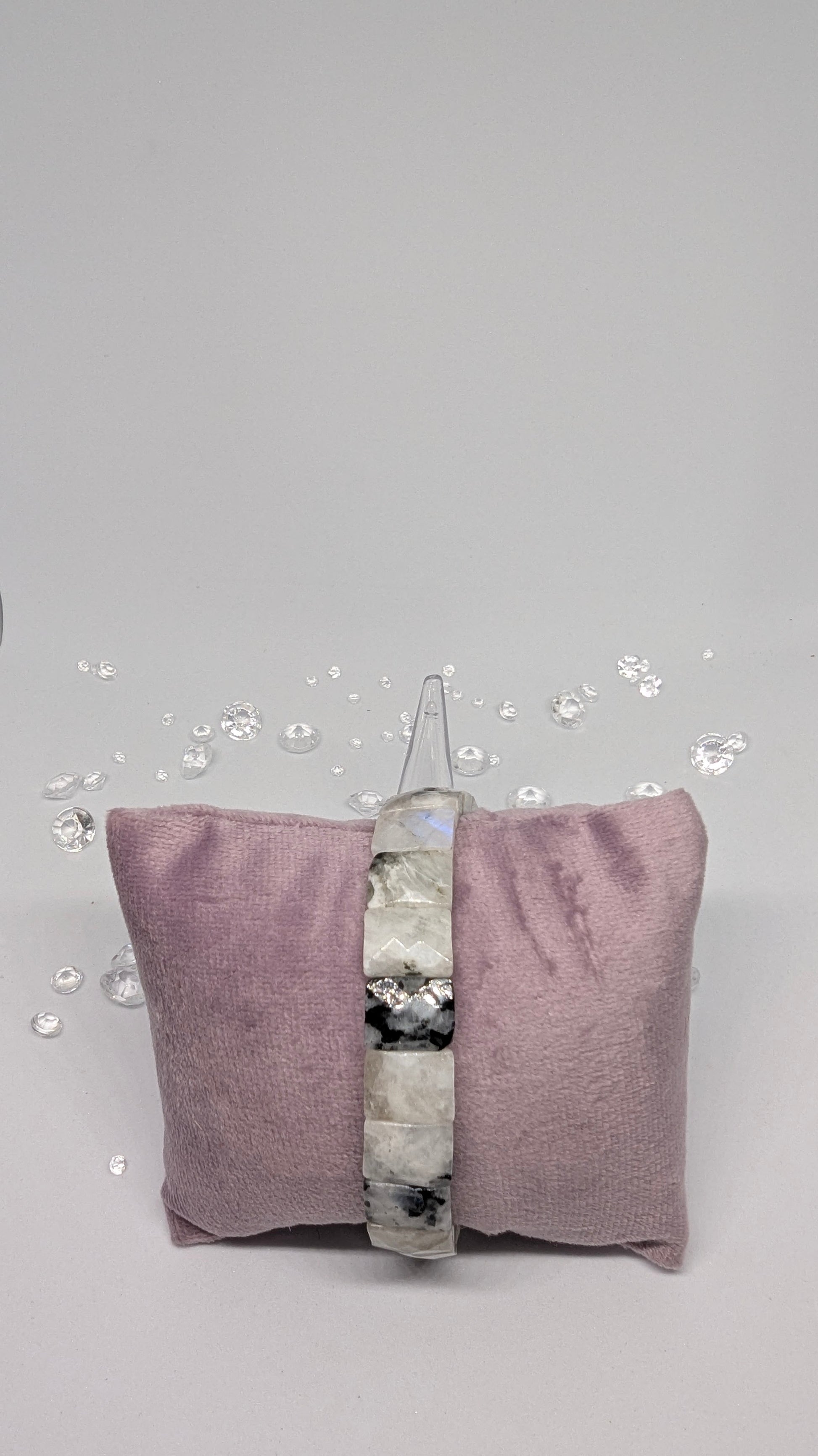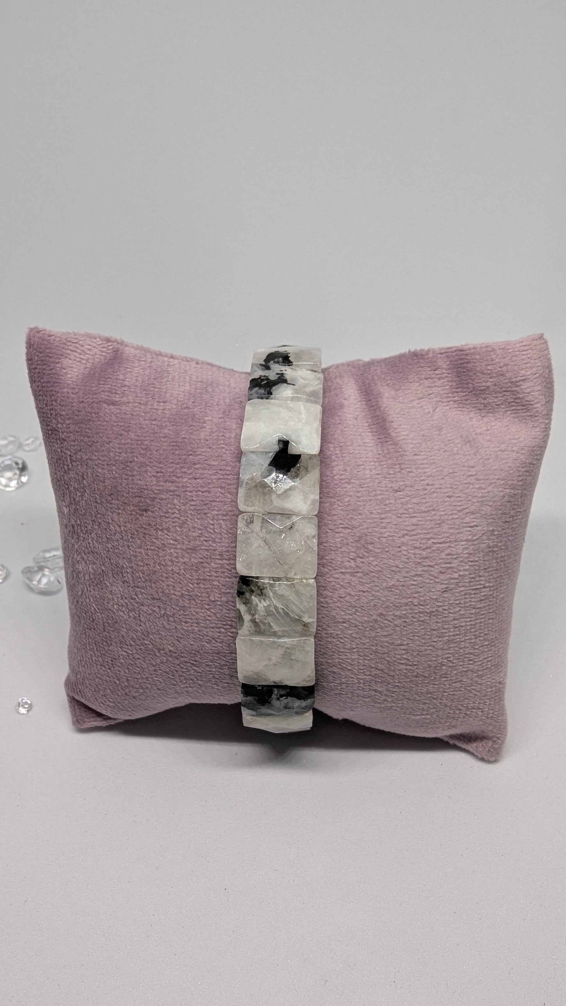 "Expertly crafted with Indian moonstone, this 17cm statement bracelet exudes luxury. The weighty white and black stones are skillfully handmade, making each piece unique. Elevate any outfit with this beautiful and one-of-a-kind accessory."