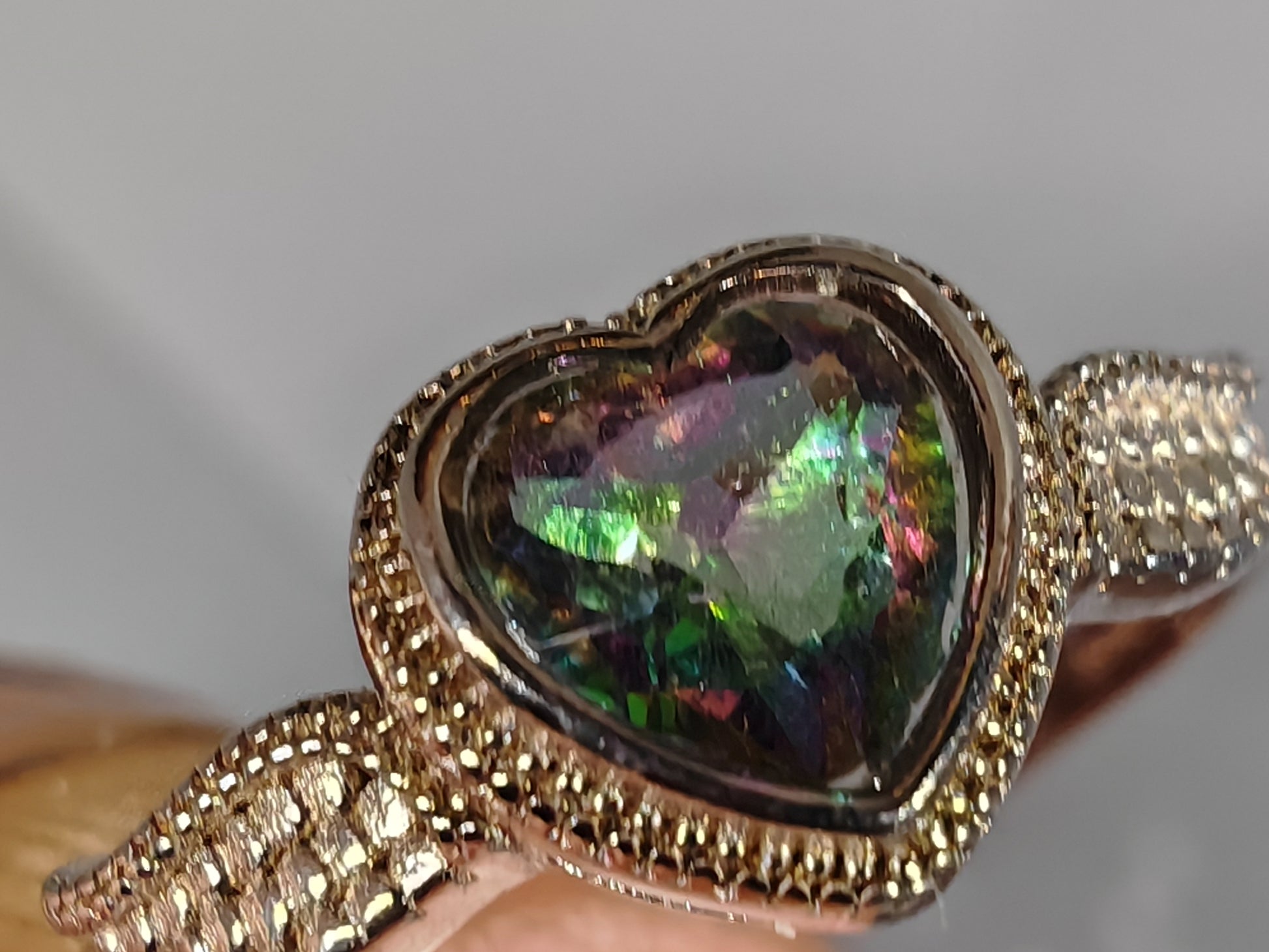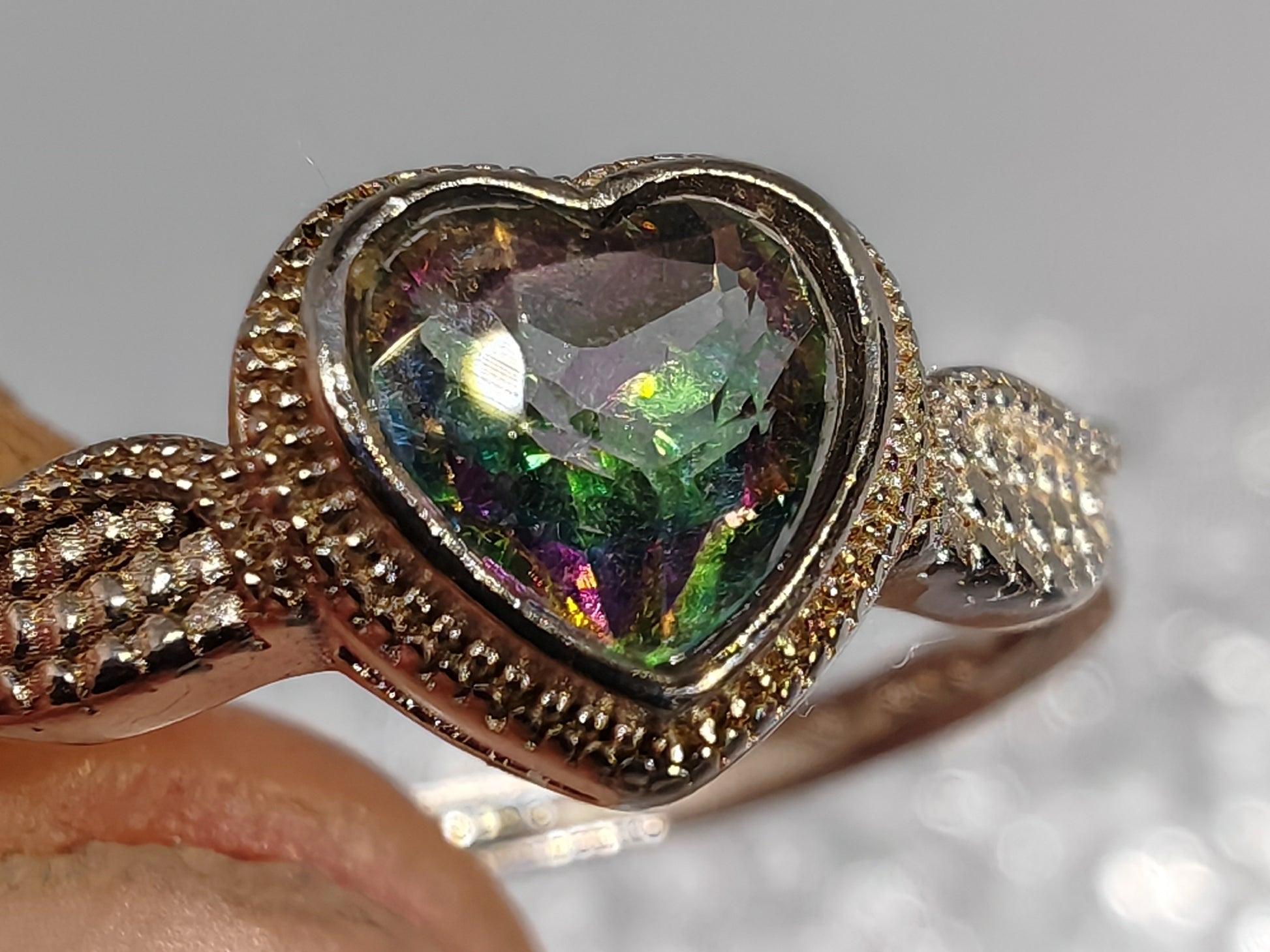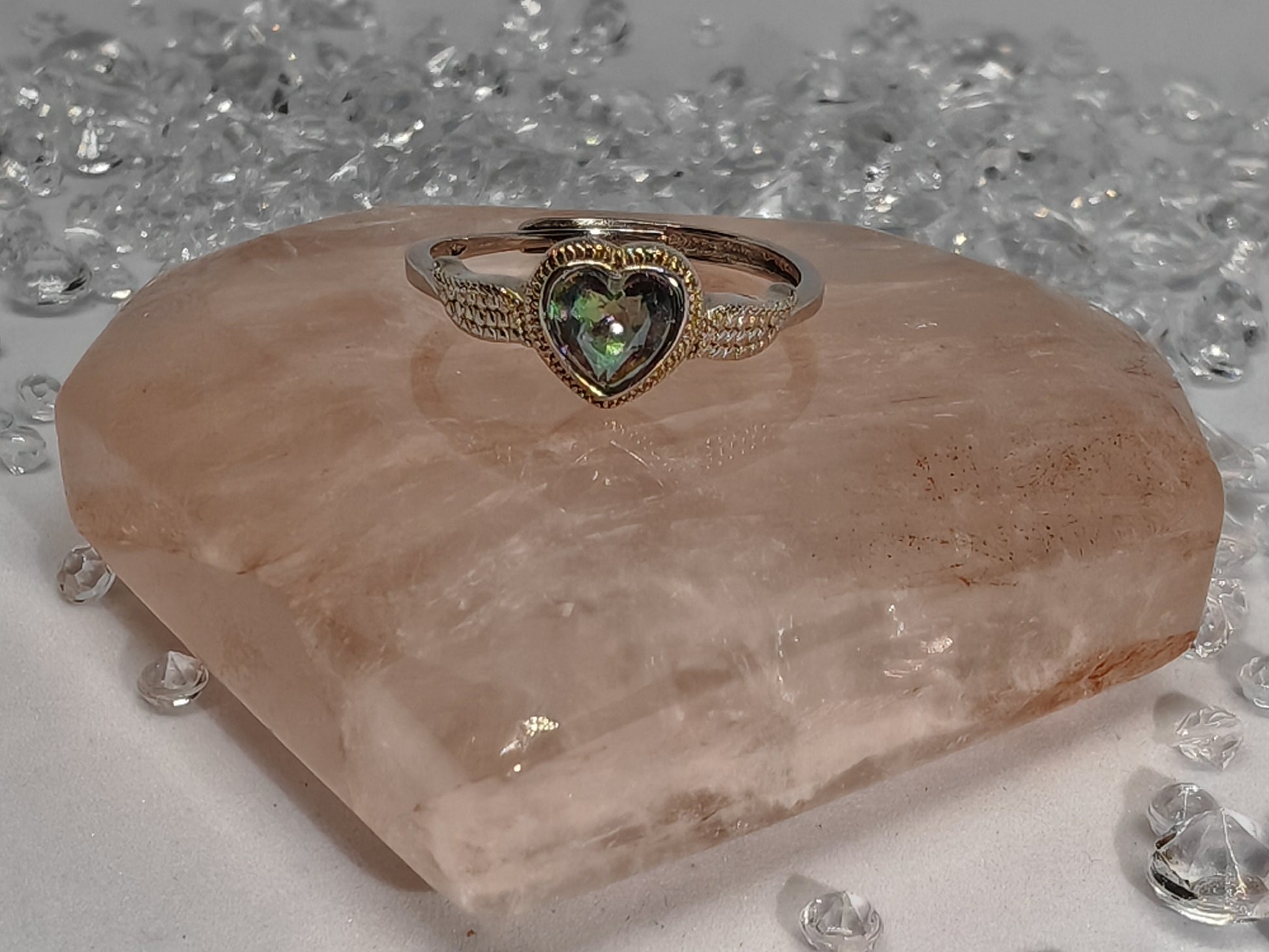 Embrace the mystical power of the Mystic Angel ring, crafted with sterling silver and featuring a stunning mystic topaz. The carved wing shoulders and studded surround add unique details, while the beautiful peacock colors evoke a sense of magic and wonder. Adjustable up to size R, this ring is a true treasure for any jewelry collection.