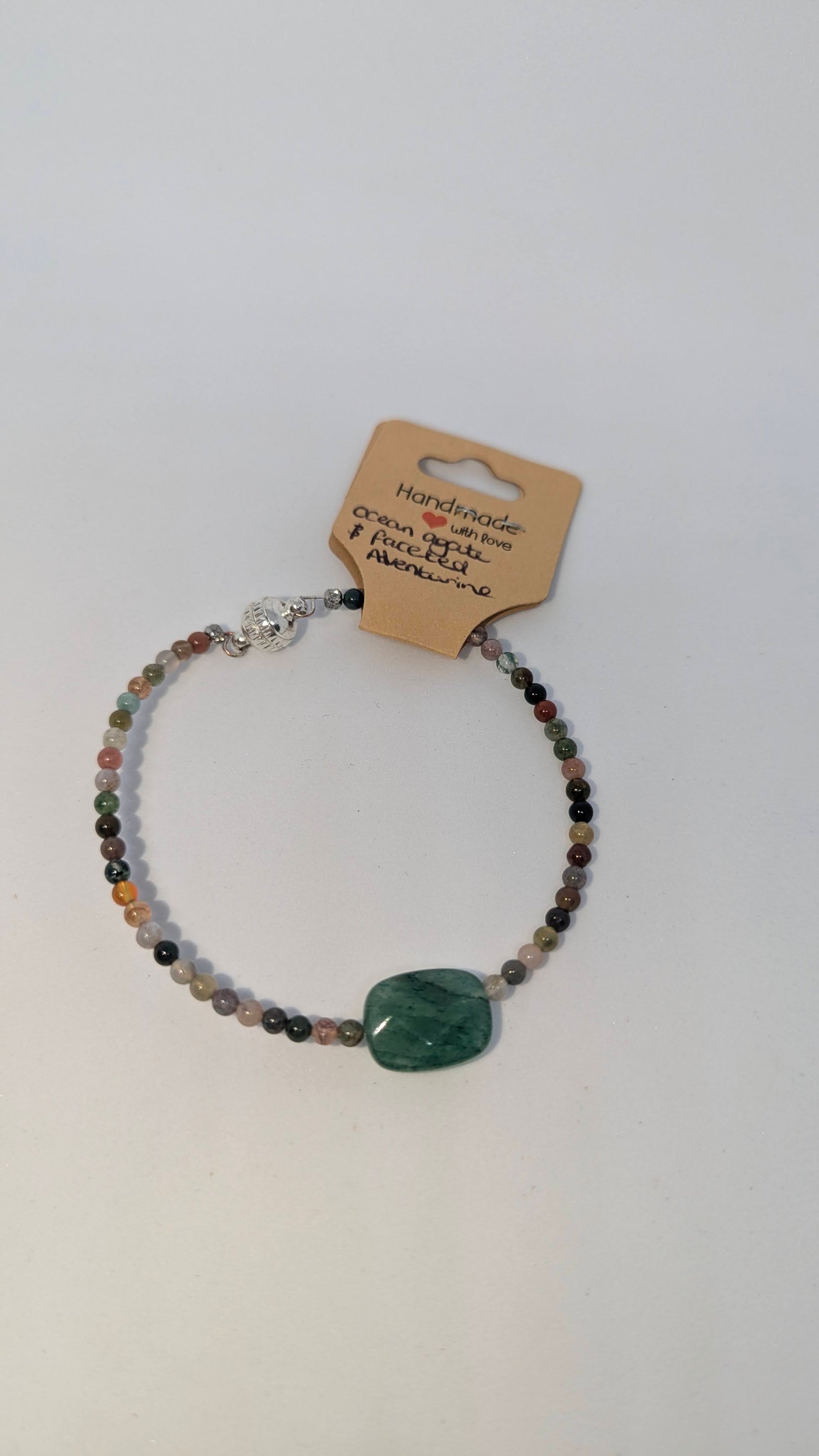 Elevate your style with our Ocean Agate & Faceted Aventurine bracelet! The small ocean Agate beads evoke tranquility while the silver magnetic clasp ensures a secure fit. The faceted Aventurine finishing stone adds a touch of elegance. Perfect for those who seek balance and positivity.