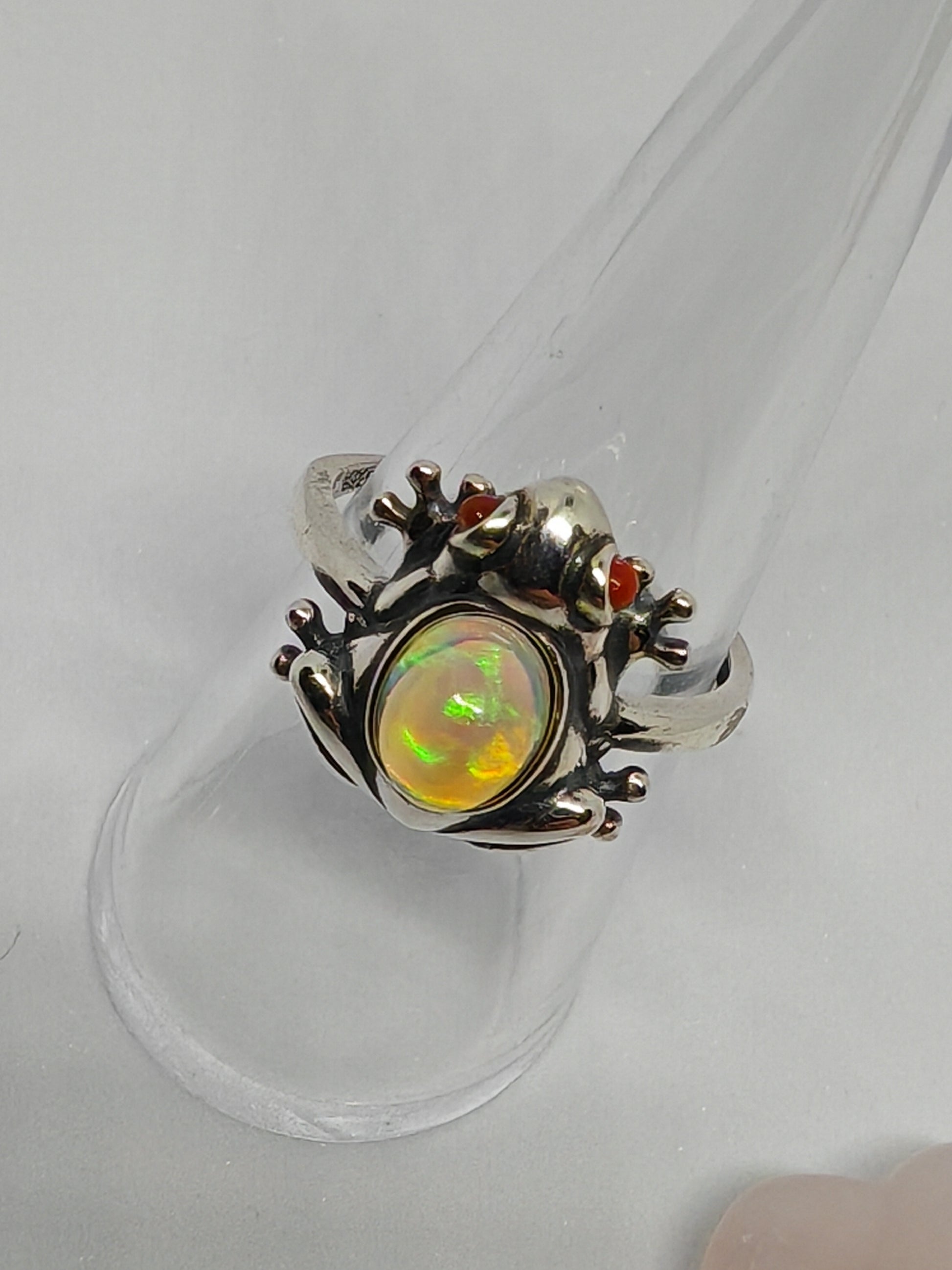 Another for the animal lover, this large opal sits neatly on the frogs back giving wonderful blues and greens in the light. The frog is part of the sterling silver band with small red stone eyes. You will fall in love with this little one. Sterling silver and adjustable.