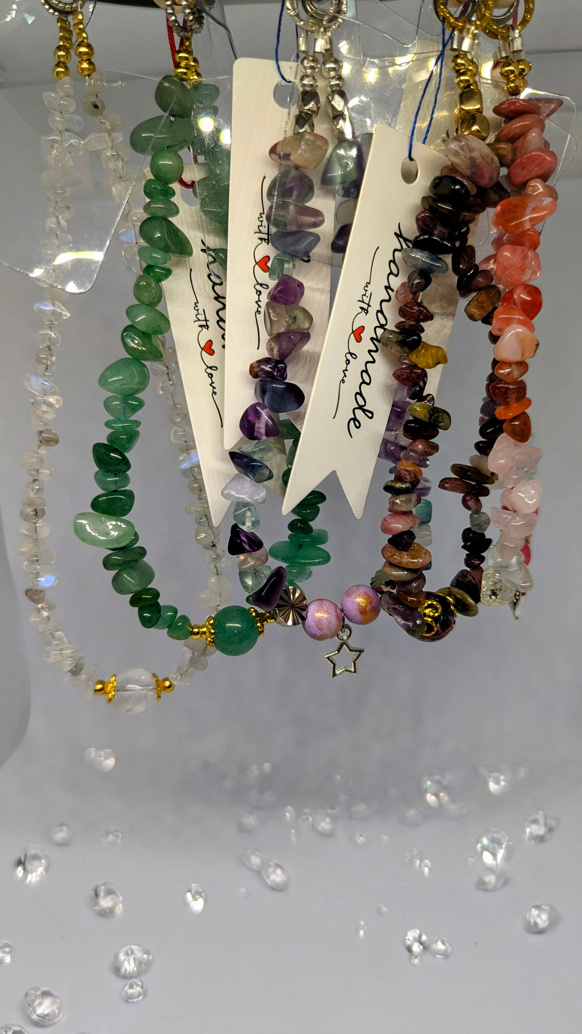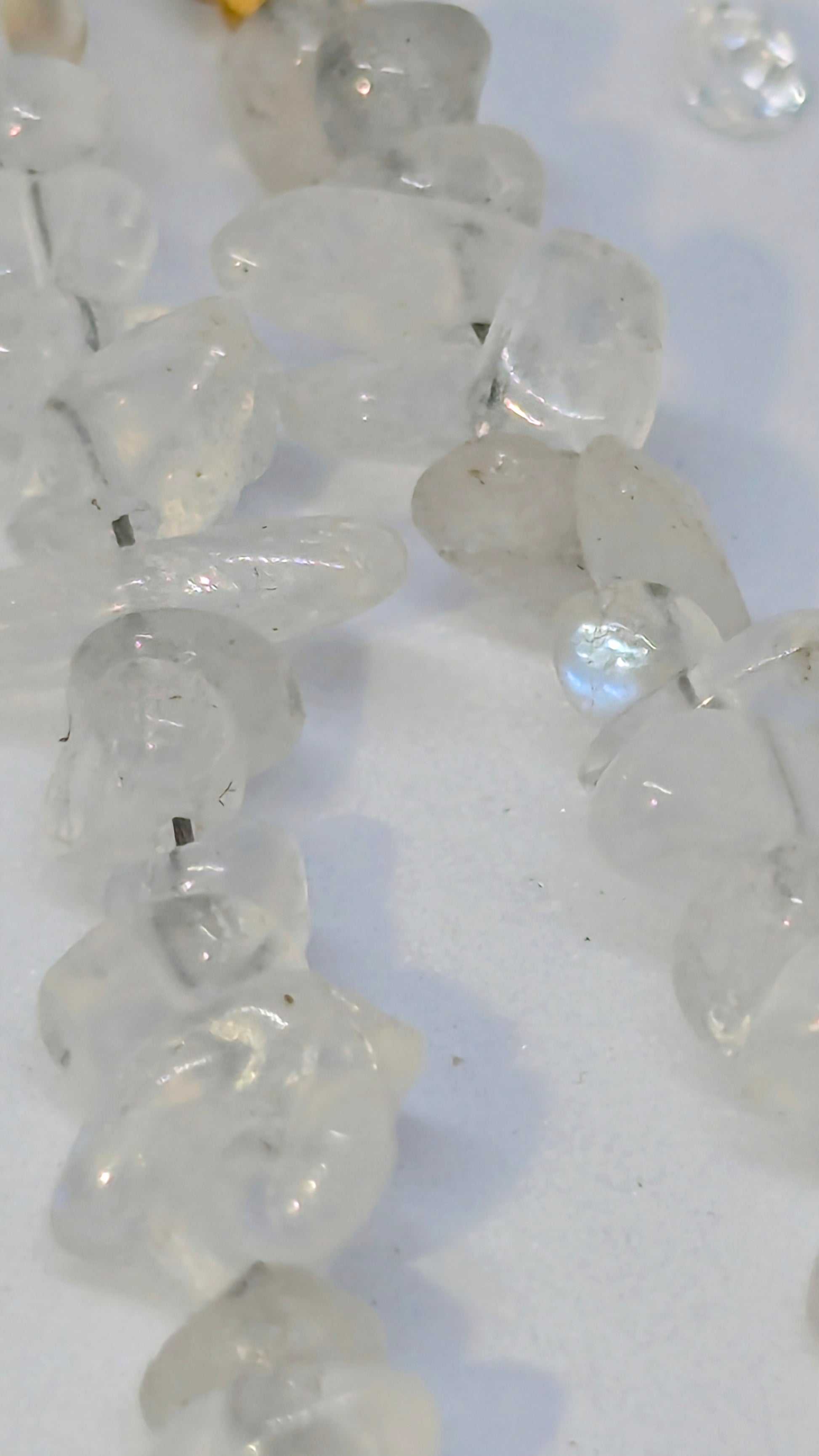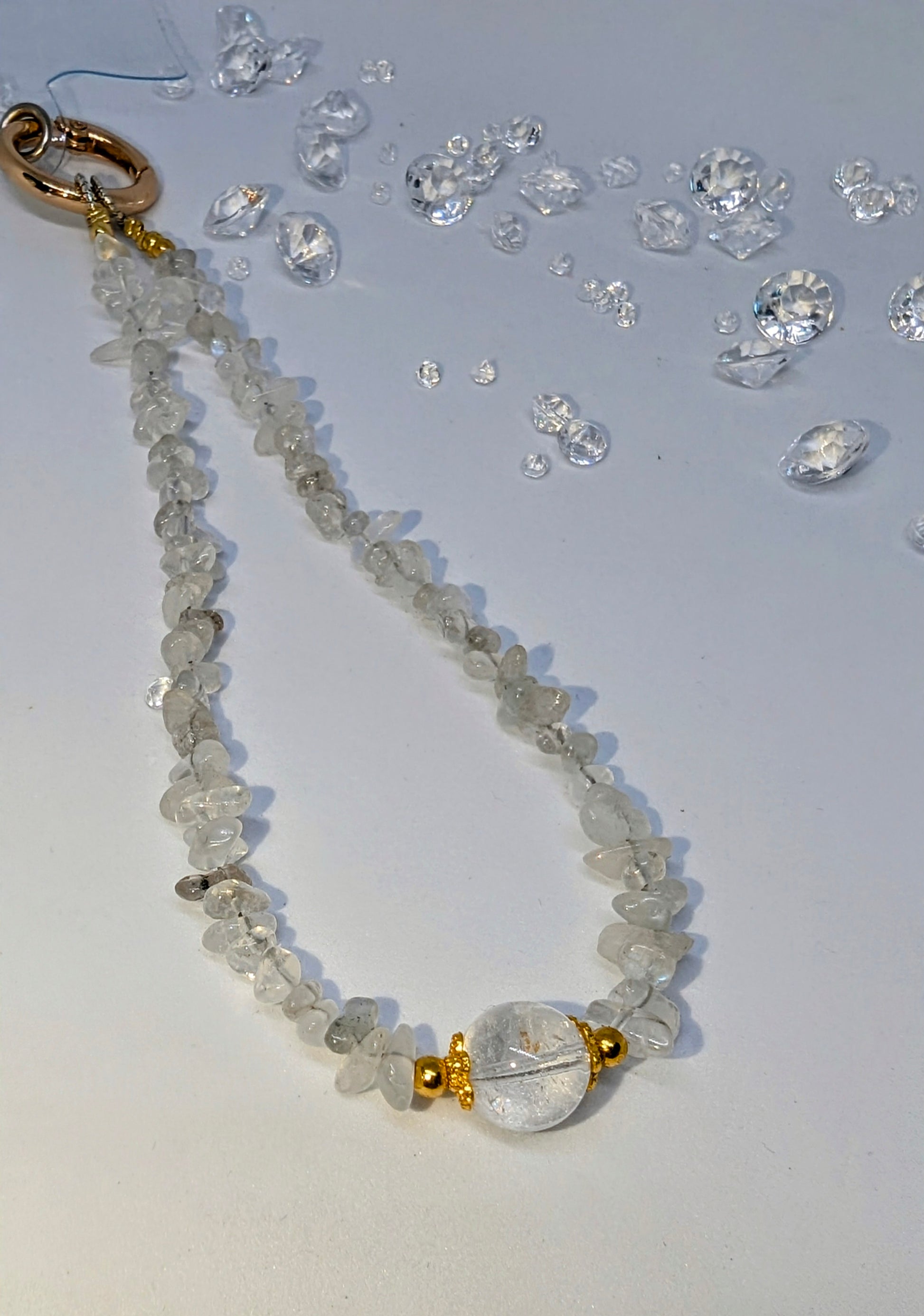 Moonstone chips with a blue flash Experience the luxury of security and style with our Moonstone Phone Wristlet. The shimmering moonstone chips with a captivating blue flash make this wristlet a glamorous accessory for any occasion. Keep your phone close and elevate your look with our phone charm wristlet.