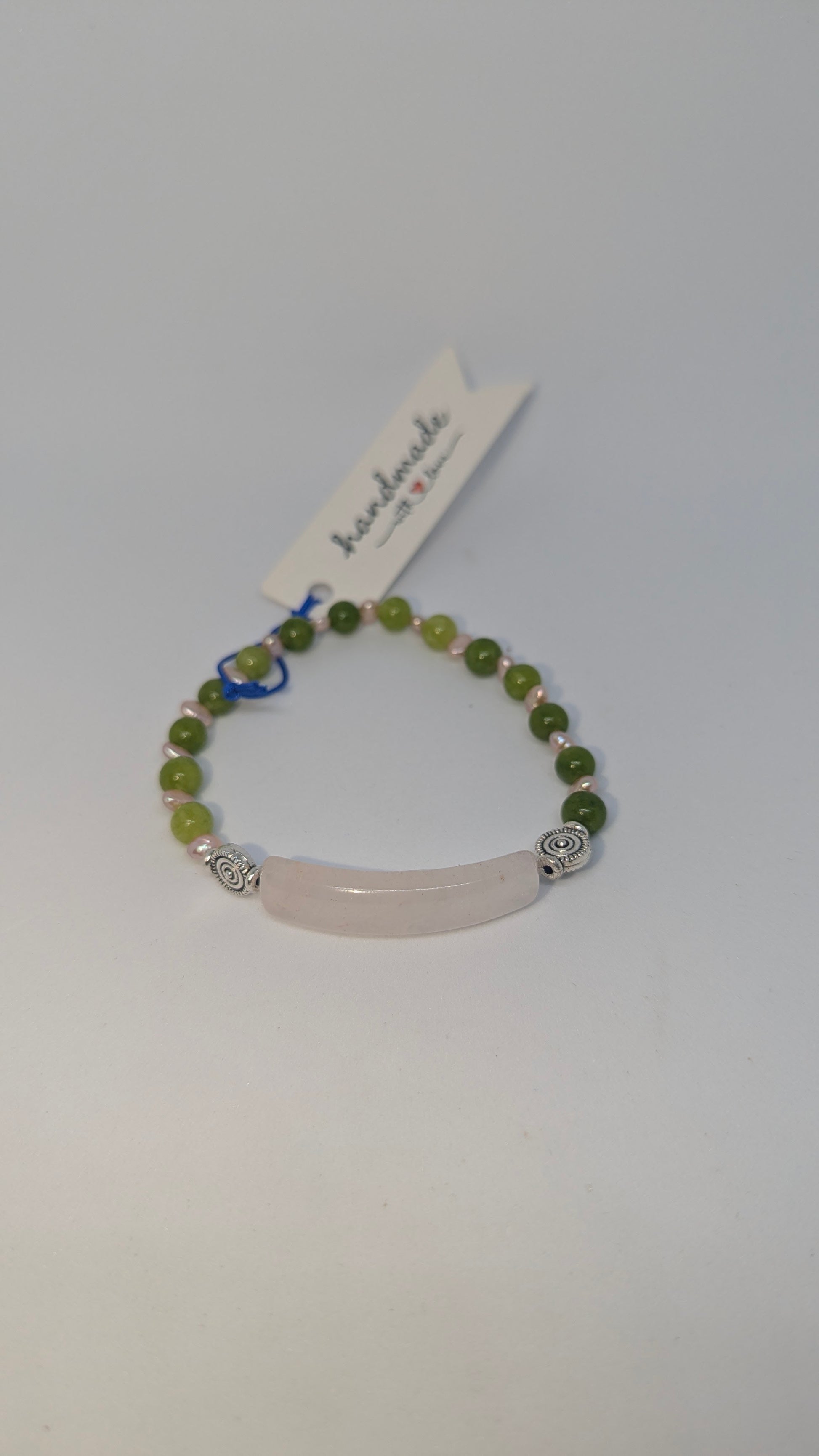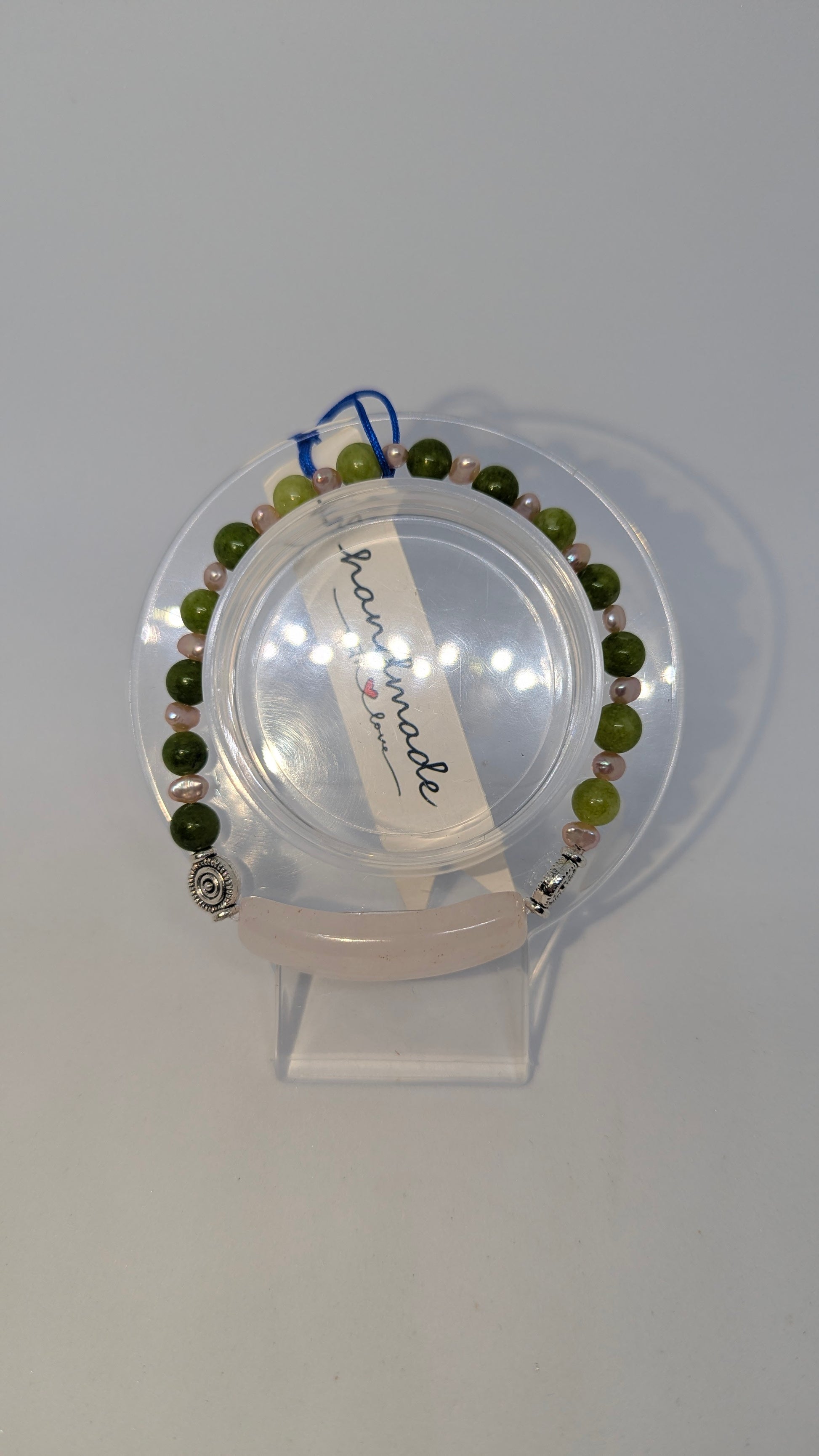 Experience the beauty of nature with our Rose Quartz, Peridot & Cultured Pearl bracelet! Adorned with a large piece of rose quartz, peridot beads, and small pearl spacers, this bracelet exudes elegance and charm. The silver accents add a touch of sophistication to this one-of-a-kind piece. Show off your unique style and embrace the positive energy of these gemstones.