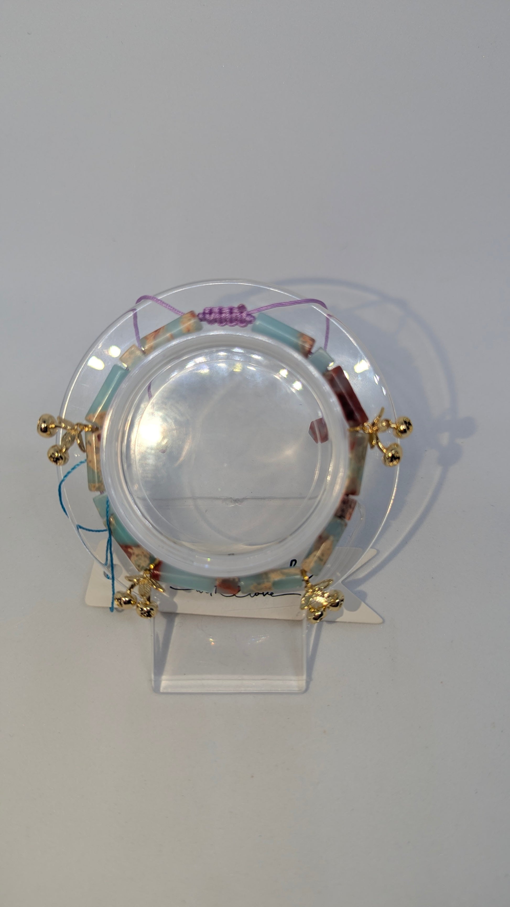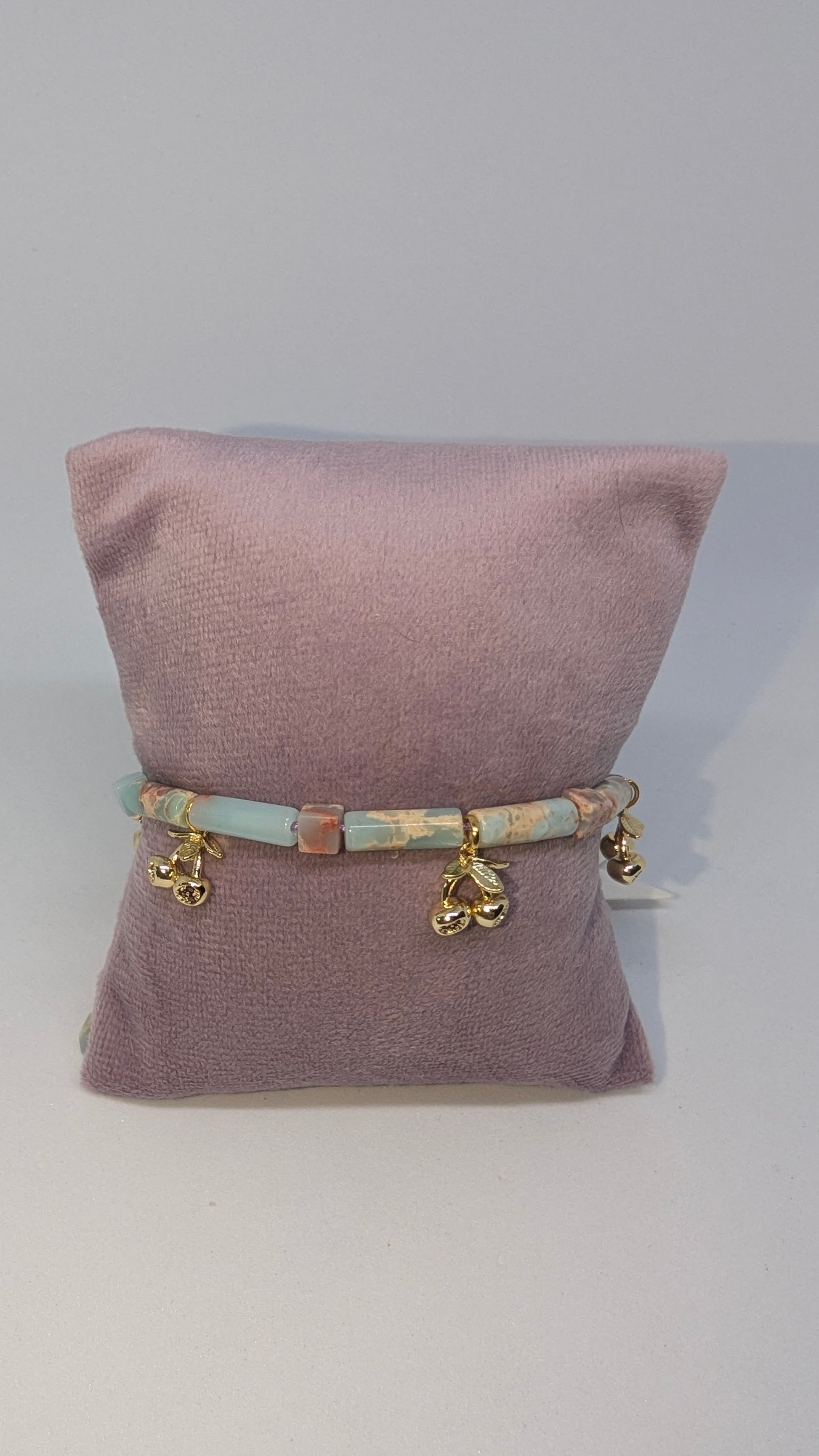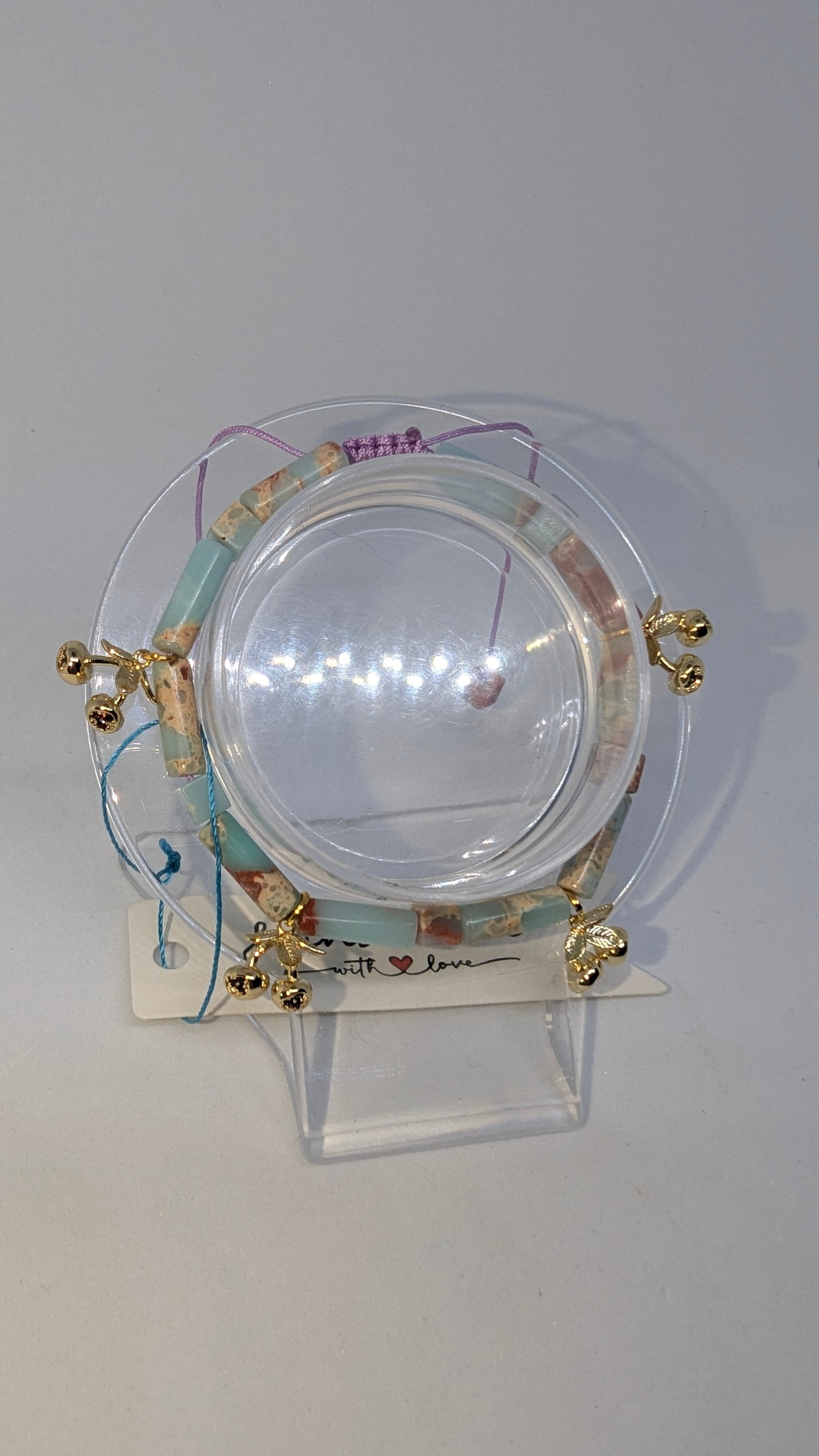 Enhance your style with our Shoushan Jasper & Cherries bracelet. Made with unique beads of Shoushan Jasper and accented with golden cherries, this bracelet's slipknot design allows for easy adjustment. Perfect for any Japanese themed outfit, this bracelet is sure to make a statement.