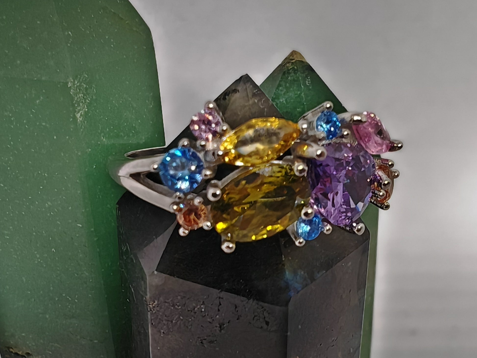 "Add a pop of color to any outfit with Spectrum Shine! Featuring a sterling silver band and colorful cubic zirconia stones in purple, pink, orange, yellow, and blue, this ring is the perfect size Q for any style. Non-adjustable, but who needs adjusting when you've got this much shine?! Get ready to make a statement!"