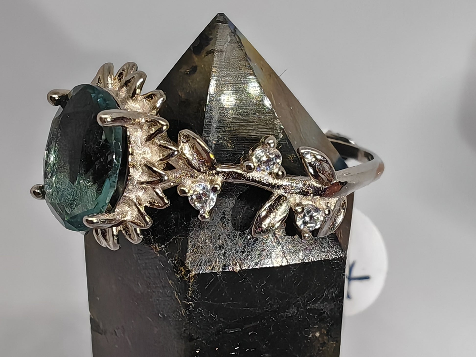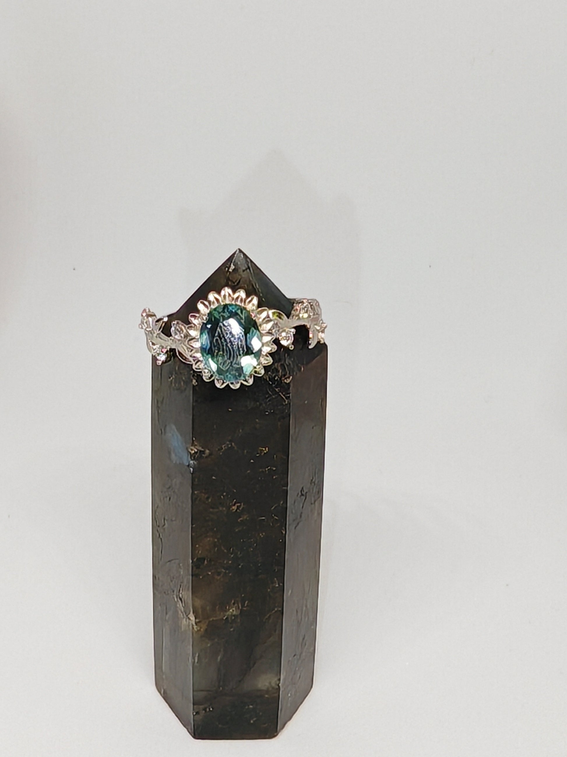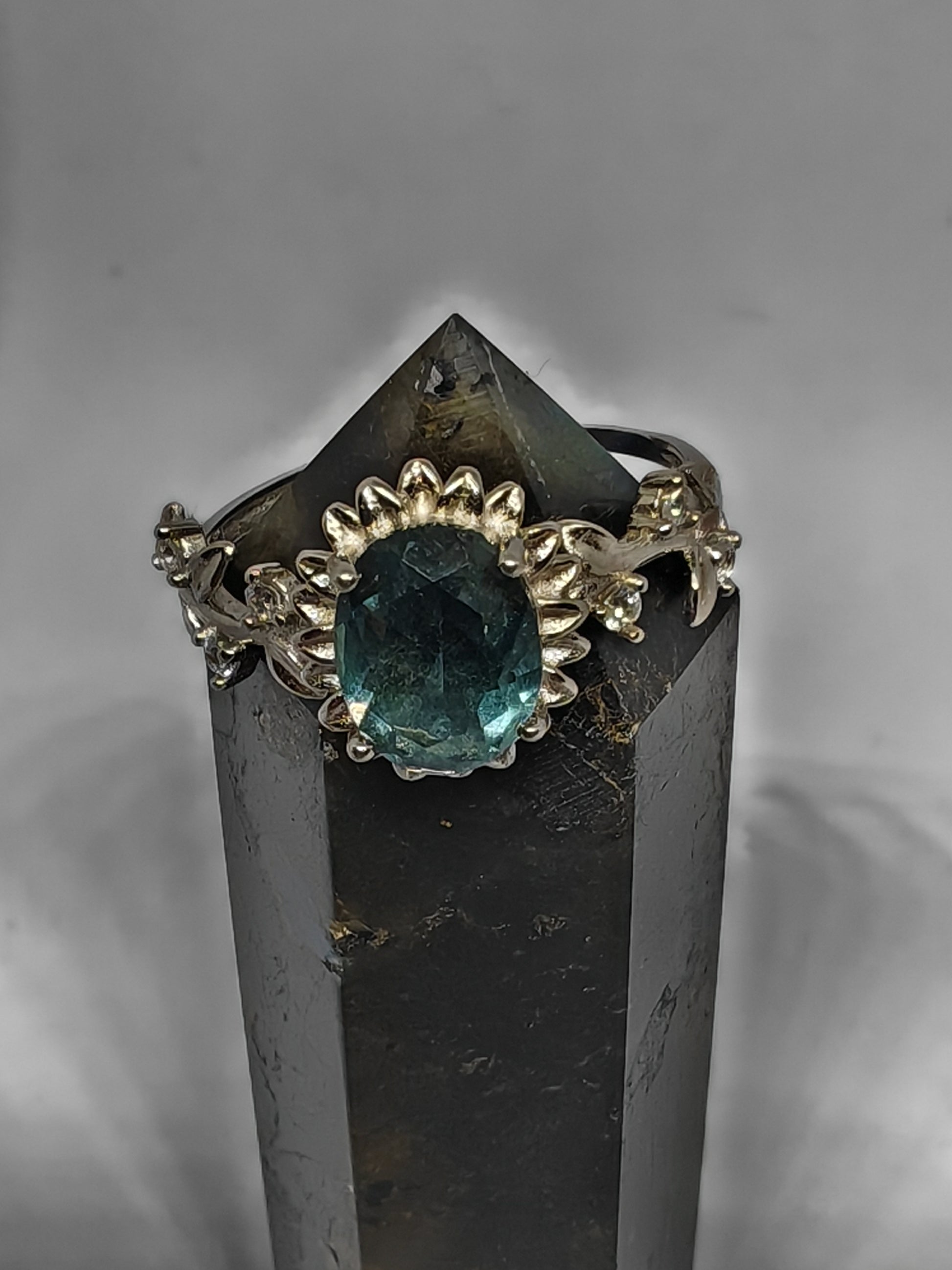 Add a touch of magic to your look with the Sunflower at Night ring. Featuring a mesmerizing blue-green fluorite set in sterling silver, this adjustable ring fits comfortably up to size W. Its playful hues and delicate design make it a perfect statement piece for day or night adventures.