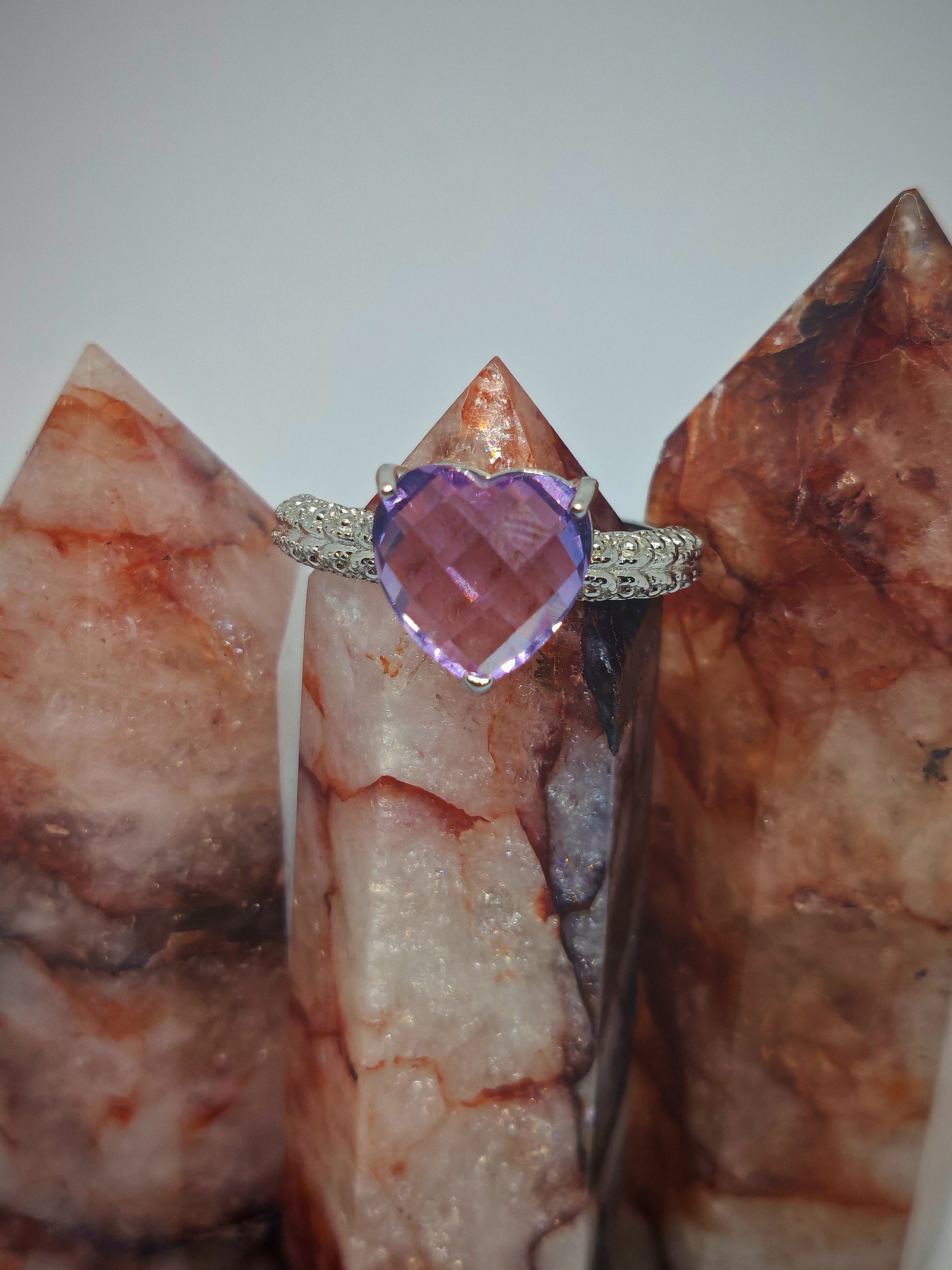 Discover the elegance of the Thousand Facet Heart ring, featuring a stunning amethyst set in sterling silver. Its intricate facets catch the light beautifully, adding a touch of sparkle to any outfit. Adjustable up to size S, this ring offers a comfortable, personalized fit. Perfect for adding a refined, heartfelt accent to your jewellery collection or as a meaningful gift.