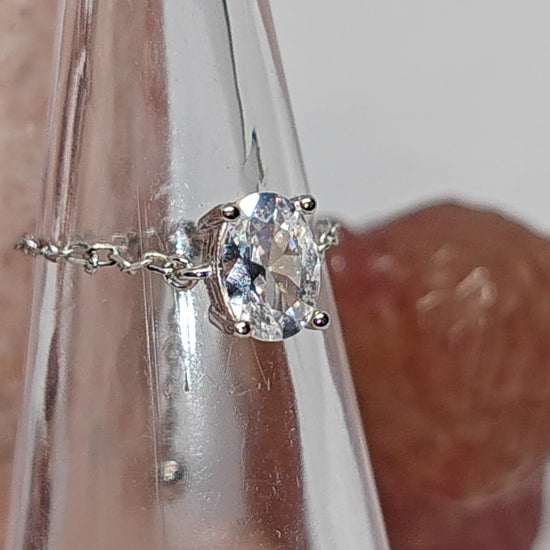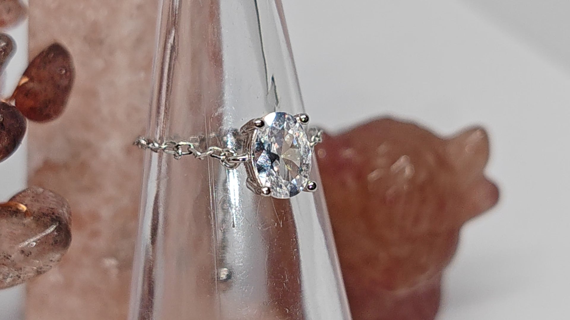 How about this for something different! This large clear quartz stone is set in a sterling silver and fully adjustable chain. It will fit most ring sizes due to its draw mechanism.
