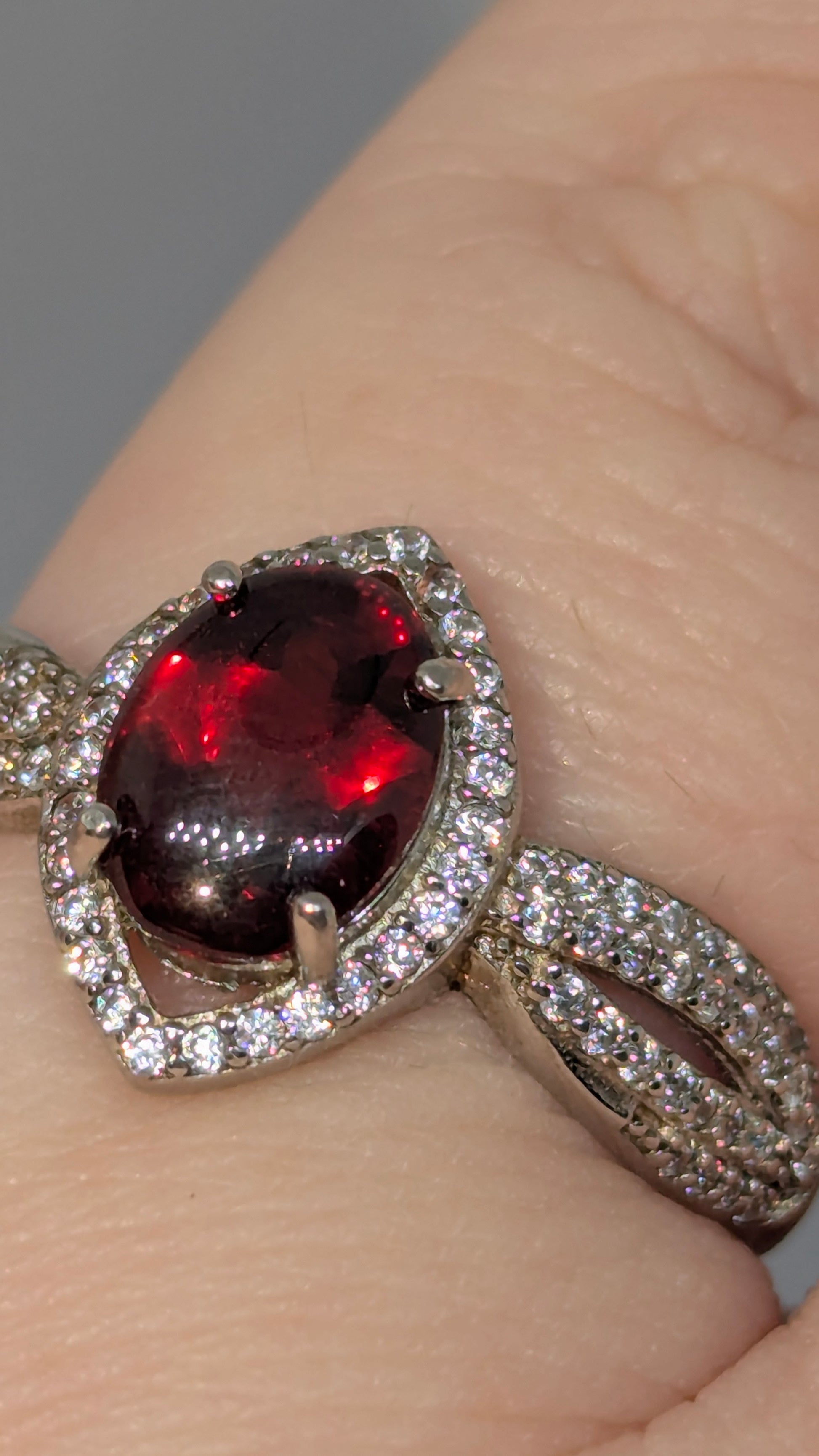 Unleash your bold and daring side with our Glamorous Garnet ring! With a polished faceted garnet at its center, surrounded by sparkling cubic zirconia, this adjustable sterling silver ring up to size T is the perfect statement piece for those who love taking risks. Don't miss out on the adventure, grab yours now!