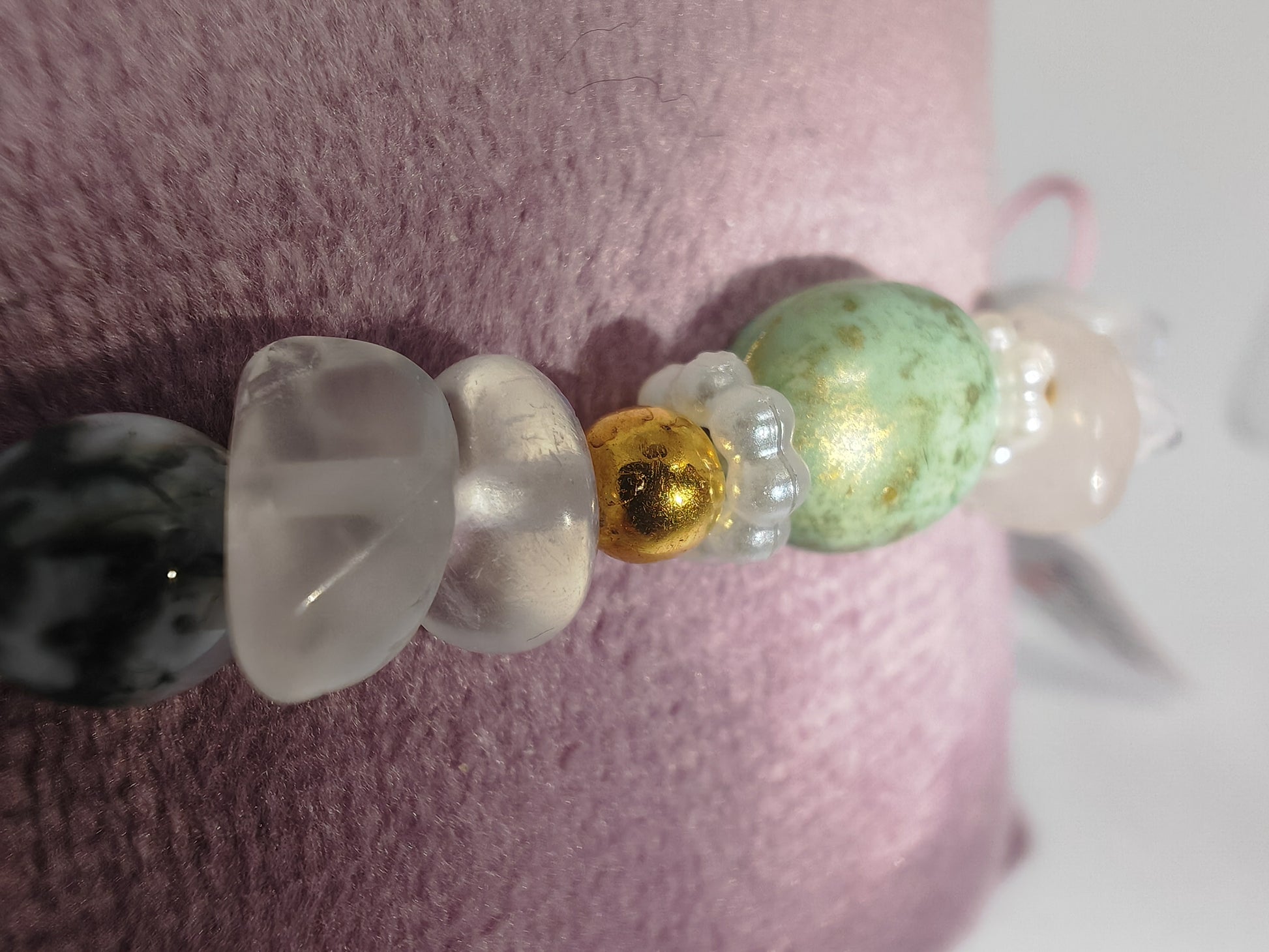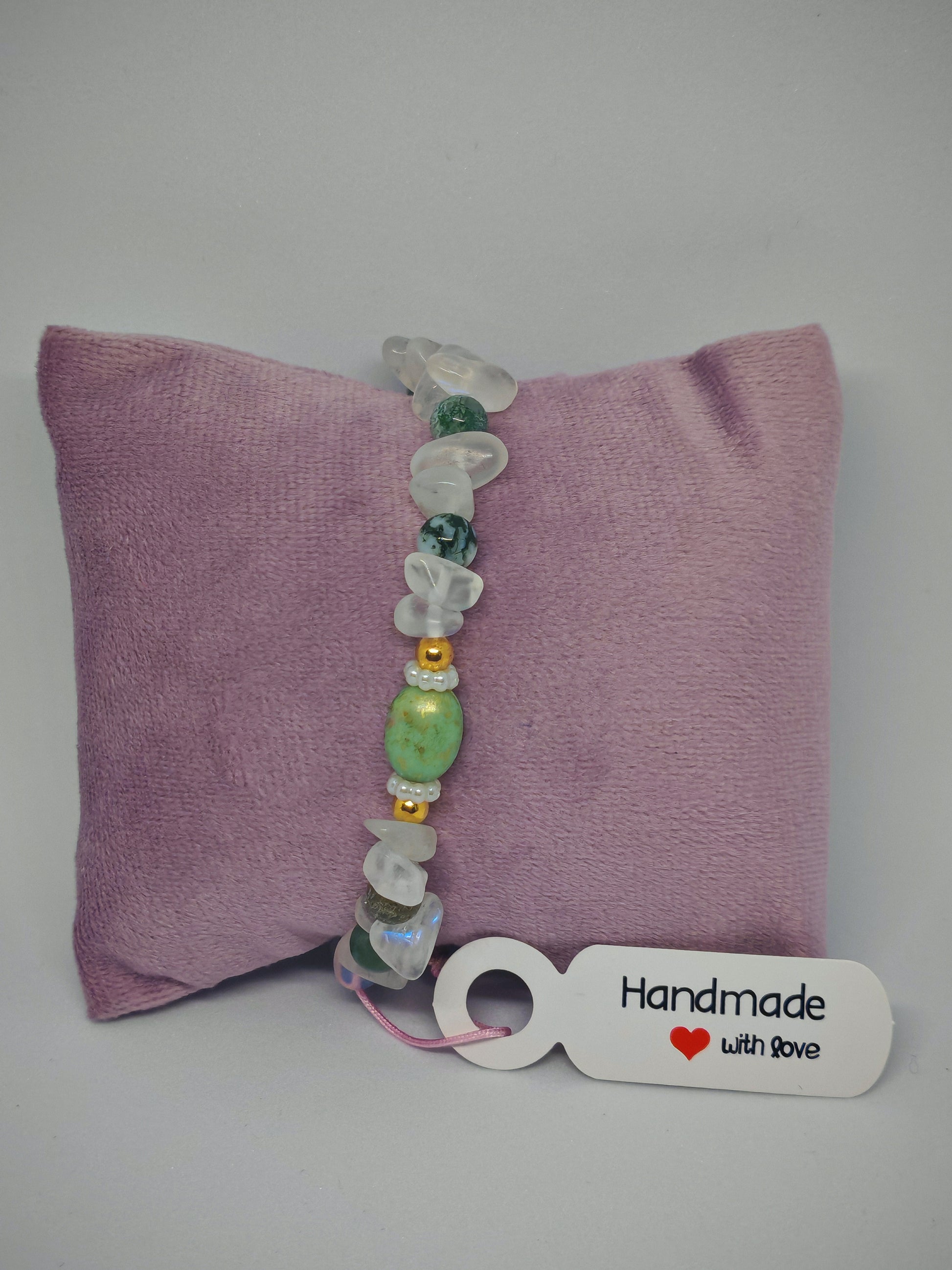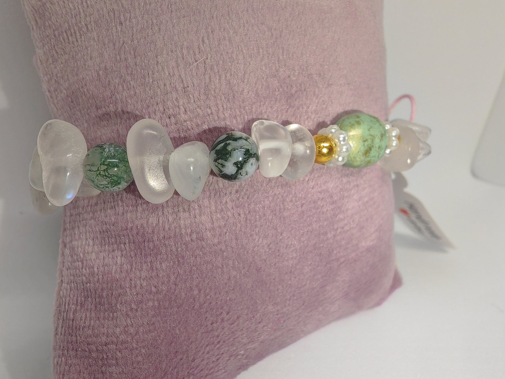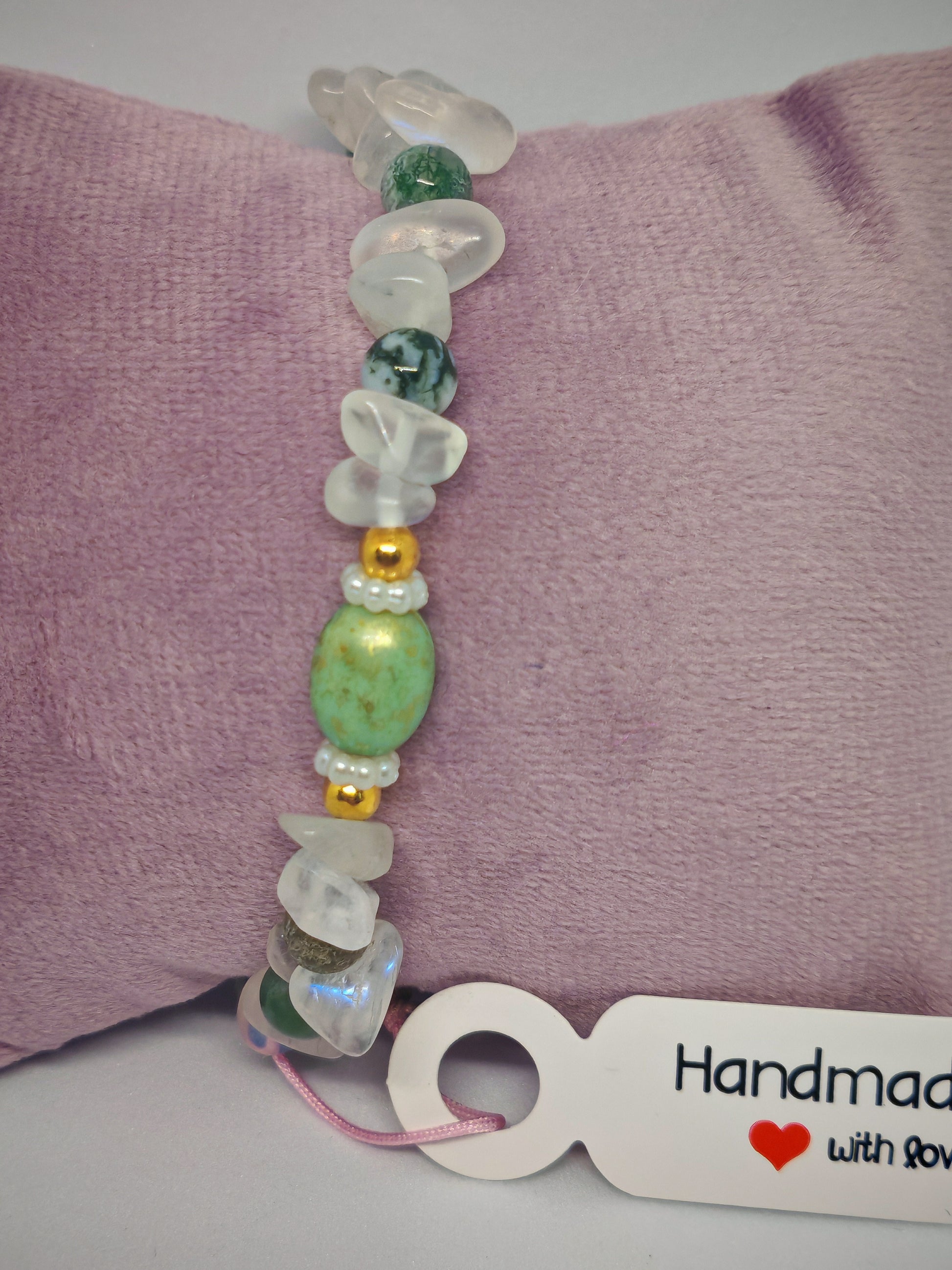 Expertly crafted with natural moonstone chips and moss agate beads, the Green Moon bracelet features a coffee bean bead and spacers for a unique touch. Handmade and stretchy for easy wear, this bracelet combines the healing properties of both stones for a calming and grounding accessory.